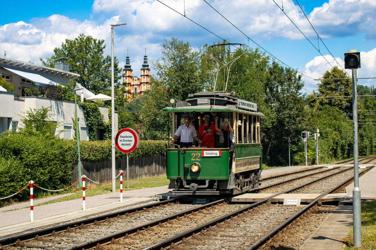Graz. Einer der ältesten, noch erhaltenen Straßenbahngarnituren im Tramway Museum Graz, ist der Triebwagen 22. Der 1899 gebaute Triebwagen hatte die Ehre, am 29.06.2025 eine kurze Ausfahrt zu genießen, hier ist er in Teichhof zu sehen.