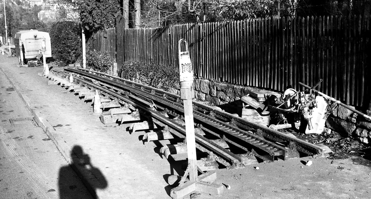 SSB Stuttgart__Zahnradbahn__Am nächsten Morgen verkehrt die Zahnradbahn bereits wieder, auf dem erneuerten Gleis. Auf dem Gehweg liegt der ausgediente Riggenbach-Gleisrahmen. Weiter oben liegt noch Nachschub zum Austausch für die kommenden Nächte. Die geübten Ohren vernehmen ein ganz neues Fahrgräusch auf dem neuen Gleis.__05-11-1977