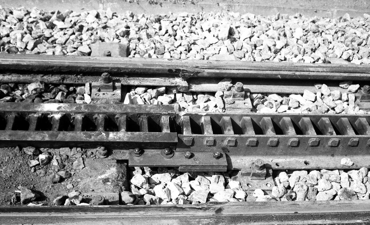 SSB Stuttgart__Zahnradbahn__Im Detail zu erkennen: die uralten Eisen-Schwellen und bei der "Original" Riggenbach-Zahnstange die zwei parallelen Winkelstähle zwischen denen die einzelnen senkrechten “Klötze“ verankert sind. Es handelte sich um eine sehr aufwändige Ausführung, die Durchbrüche für die Klötze mussten einzeln ausgefräst und die Klötze von Hand eingenietet bzw. eingeschweißt werden.__05-11-1977