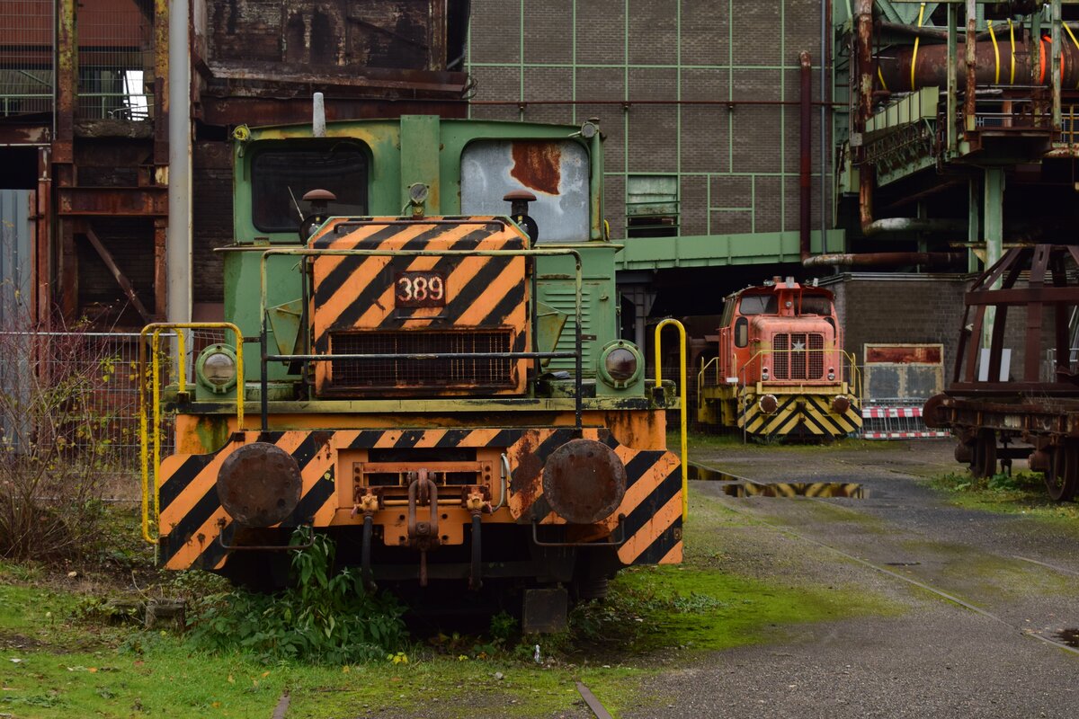 Blick auf die Lok 389 des Typs EL 07. Die Lok wurde 1955 von Krauss-Maffei unter der Fabrik Nummer 18163 als EH 104 gebaut. 1992 wurde sie in 389 umbenannt. Im Hintergrund steht die ehemalige Lok 52 der VSG - Vereinigte Schmiedewerke GmbH, Werk Hattingen. Die Lok der Bauart DH 500 Ca wurde am 11.1.1962 als D34 an die Ruhrstahl AG Henrichshütte, Hattingen ausgeliefert. Bis in die 80er Jahre war die Lok im Einsatz ehe sie in den 90er Jahren an das WIM - Westfälisches Industriemuseum, Henrichshütte, Hattingen überging.