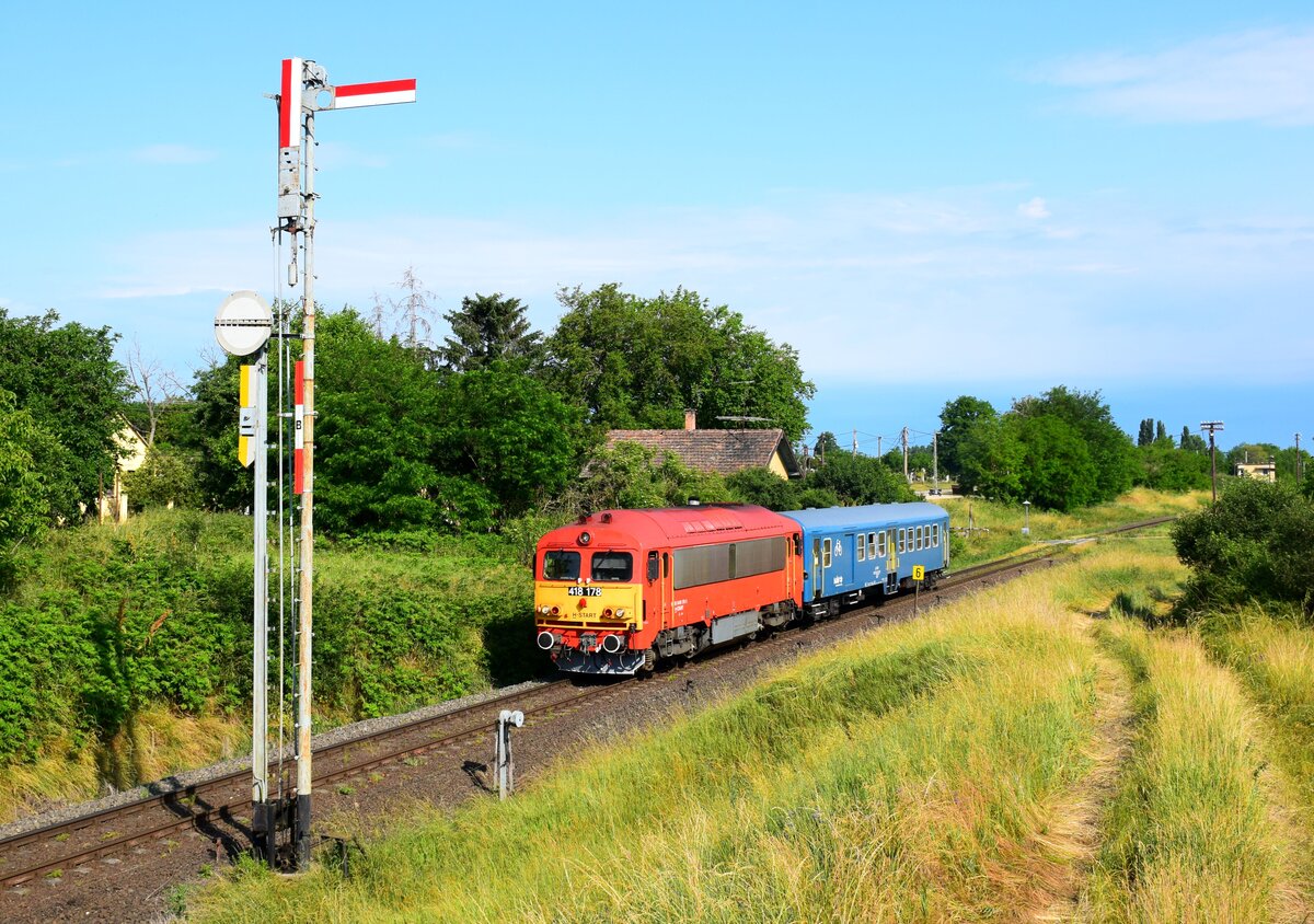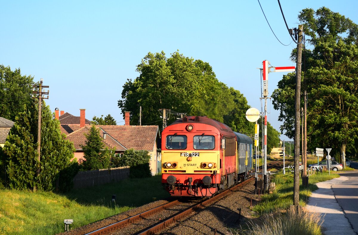 Die 418 122 ist mit dem Abendzug 34918 unterwegs von Székesfehérvár nach Komárom kurz nach Kisbér.