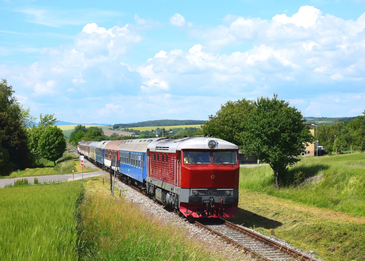 Die 751 201 (T478 1201) mit einem Sonderzug bei Tupá, in Richtung Sahy. Aus den Wolken oben rechts erscheint eine Karte von Österreich.