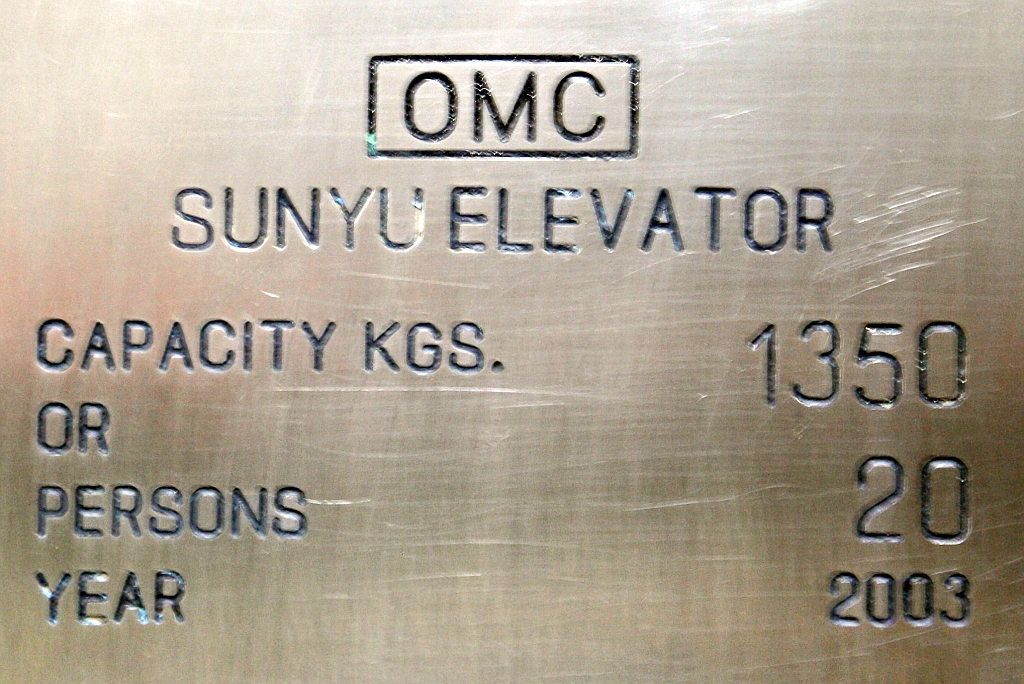 Hersteller, Baujahr und Kapazitätsangaben auf dem Bedienpaneel in der Fahrgastkabine des Tang Kuan Hill Lift, eine vollständig eingehauste Standseilbahn, in Songkhla am 16.Mai 2025.