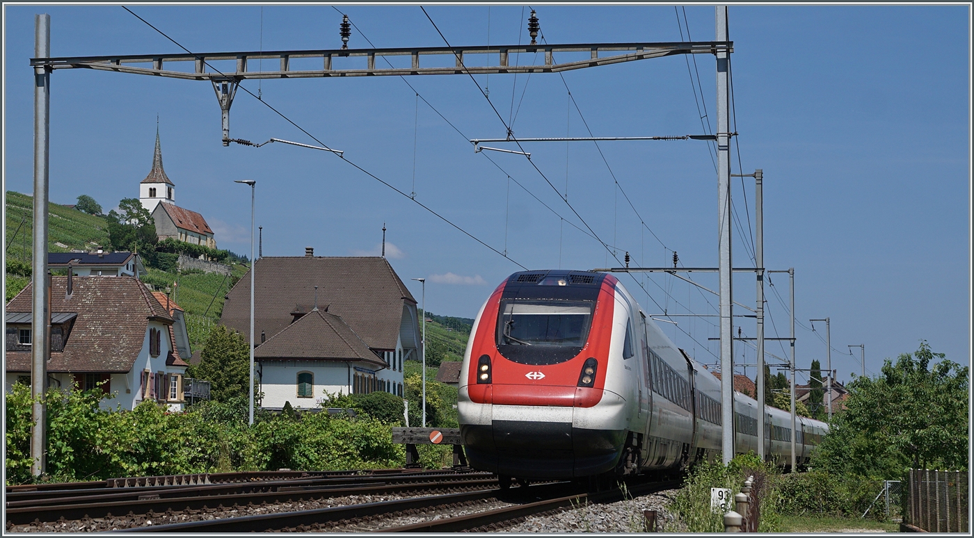 Während links oben im Bild abermals die Kirche von Ligerz zu sehen ist, ist ein für diesen Streckenabschnitt typischer SBB ICN RABDe 500 als IC5 1520 auf dem Weg von Zürich HB nach Lausanne.