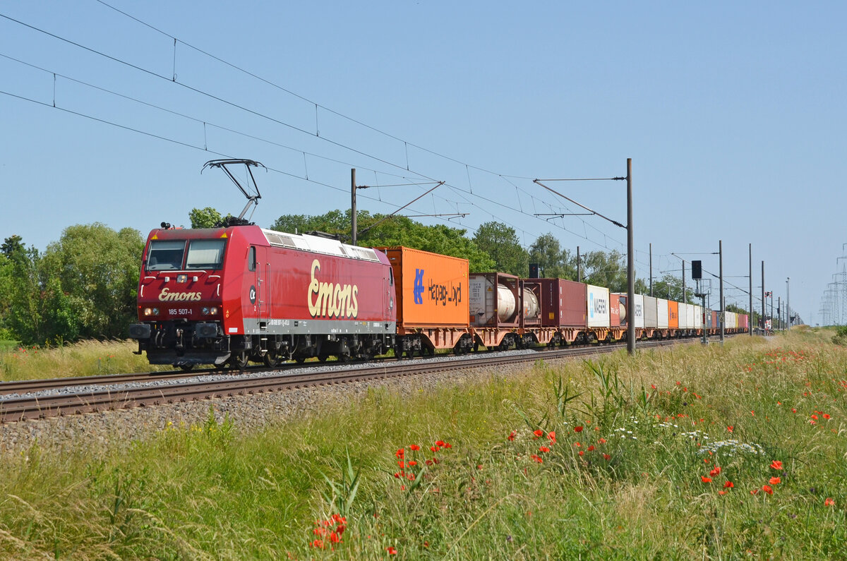 185 507 der ATLU wird mittlerweile von Emons eingesetzt. Am 14.06.25 führte sie einen  Containerzug durch Braschwitz Richtung Halle(S).