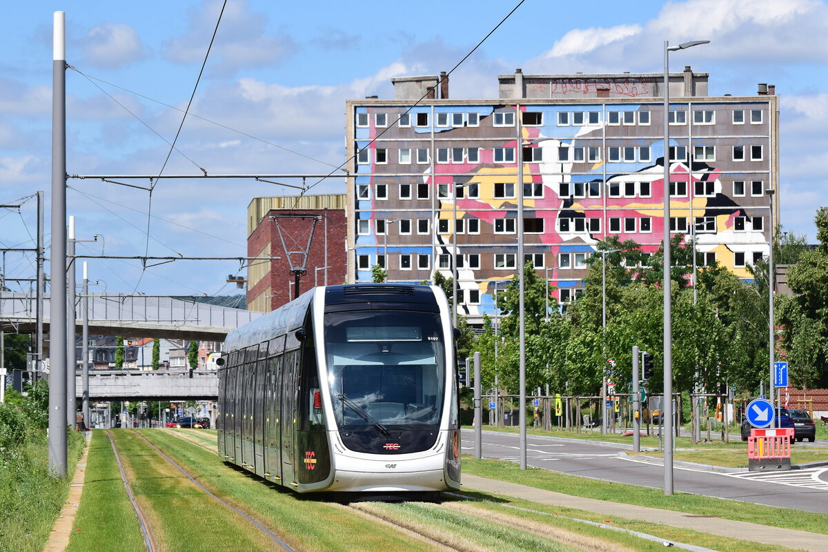 Alt und Neu. Triebwagen 5107 hat soeben die Haltestelle Val Benoit verlassen und fährt Richtung Liège-Guillemins. Lüttich 28.06.2025