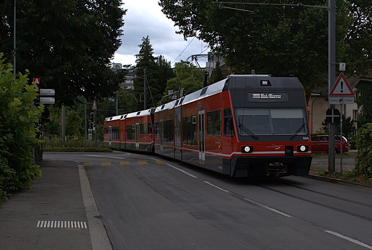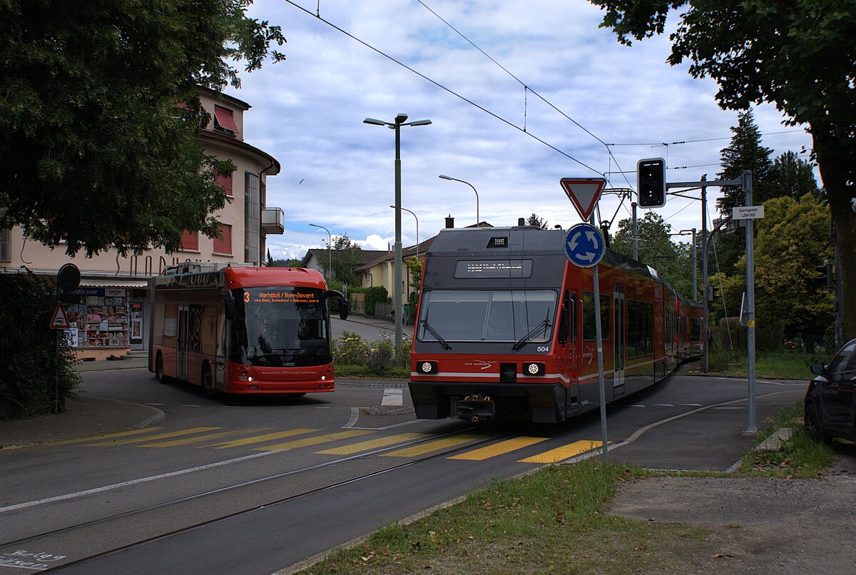 ASm BTI Aare Seeland mobil AG Biel-Täuffelen-Ins-Bahn: GTW 504 + 510, Zug 7101 Täuffelen-Biel, und Gelenktrolleybus 100 der Verkehrsbetriebe Biel, Linie 3 Mösliacker-Biel Bahnhof-Vorhölzli/Petit Marais-Bienne gare-Bois Devant, Biel, 4. Juli 2025. Lichtsignalanlaen sichern die Durchfahrt der Züge durch den Kreisel, ihre Fahrt auf der Murtenstrasse und die Querung der Salzhausstrasse. Der Streckenabschnitt hinter dem Kreisel bis zur Station Nidau (auf Gemeindegebiet von Nidau) wurde 1926 - durchaus weitsichtig - als Eigentrasse ohne Strassenbenutzung (wenn auch mit einigen Niveauübergängen) gebaut. Die BTI konnte seinerzeit erst nach dem Bau des heutigen SBB-Bahnhofes von Nidau nach Biel verlängert und damit fertiggestellt werden.