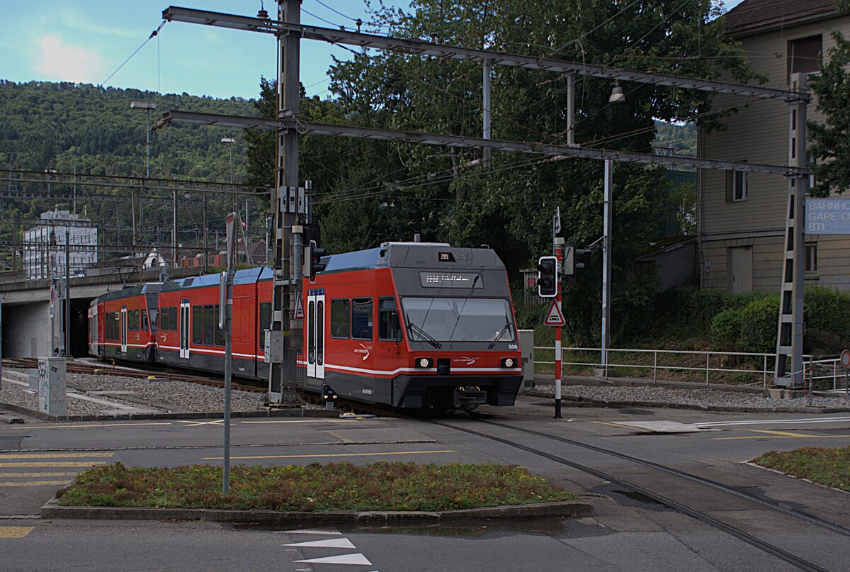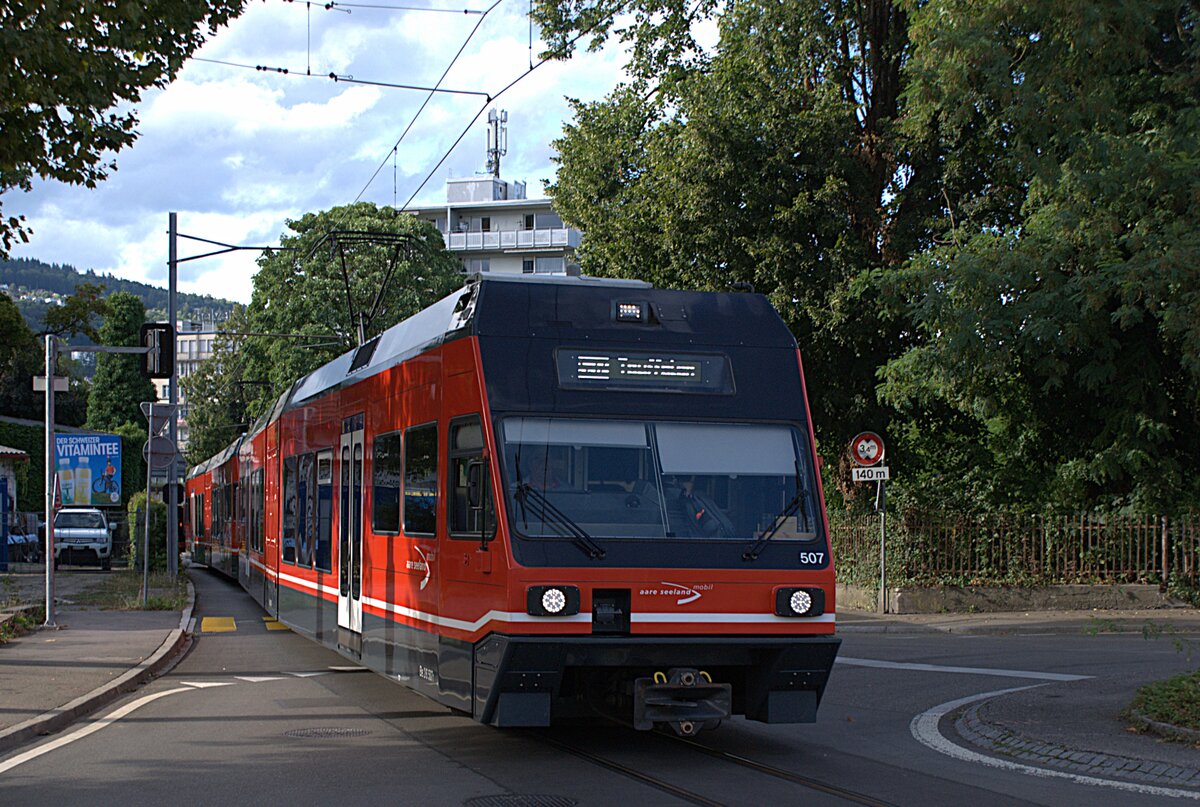 ASm BTI Aare Seeland mobil AG Biel-Täuffelen-Ins-Bahn: GTW 506 + ?, Zug 8104 Biel-Täuffelen, Murtenstrasse, Biel. Die Tunnelstation der BTI in Biel unter den SBB-Gleisen und ihre Zufahrt wurden am 22. Mai 1975 in Betrieb genommen. Das Gleis nach der BTI-Station auf dem Bahnhofplatz in Biel lag 1926 bis 1975 in der rechten Strassenhälfte in diesem Bild, wechselte für die Durchfahrt durch die im Hintergrund sichtbare Unterführung unter den SBB-Gleisen in die Strassenmitte, bog danach nach links in die Johann-Veresius-Strasse ein und erreichte dort einen letzten Abschnitt Eigentrasse (Abstellanlage und Ausweiche). Seit der Eröffnung der Tunnelstation sichern Lichtsignalanlagen die Strassenquerungen und den Abschnitt in der Murtenstrasse. Zuvor gab es nichts dergleichen.