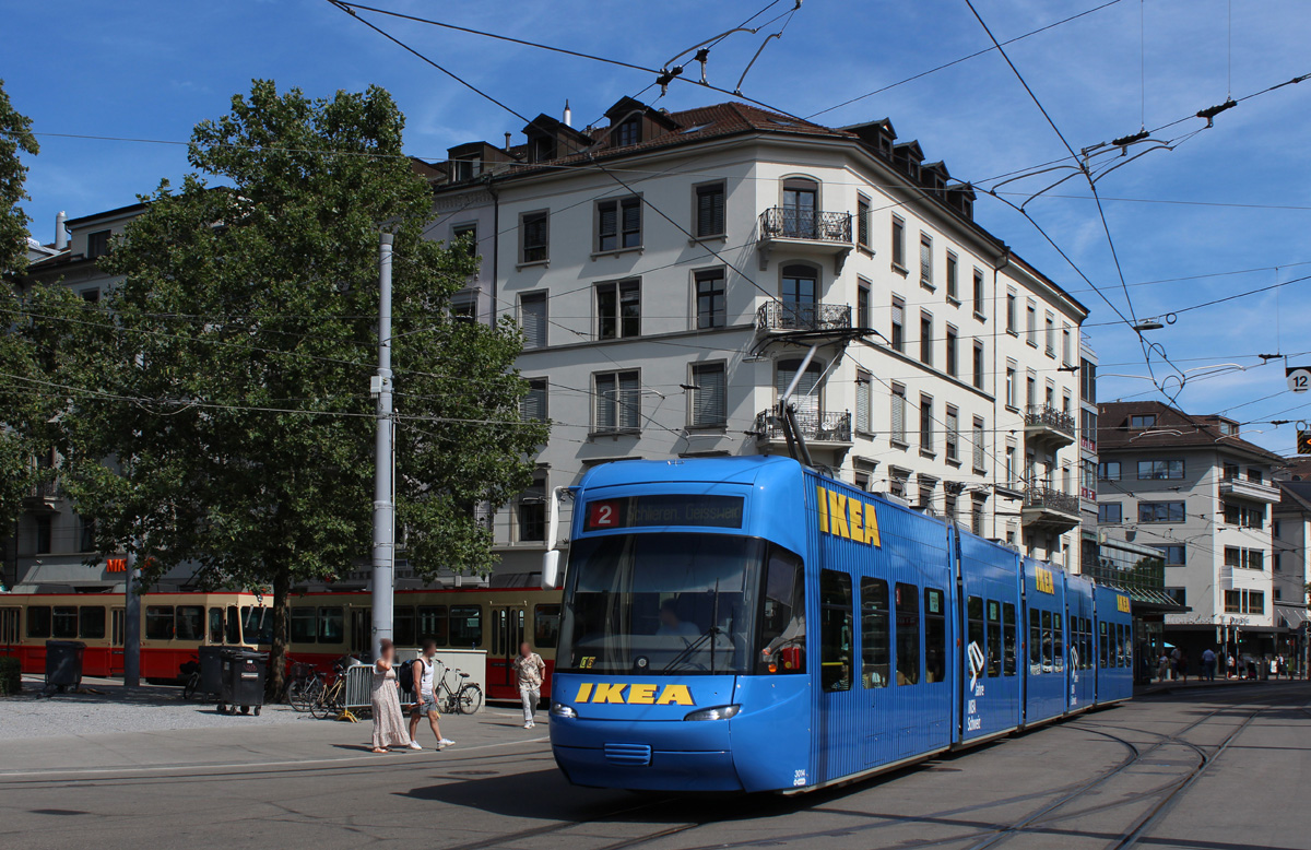 Cobra-Tram mit Werbung  Lusso  am 18. Juli 2025, kurz vor Sonnenuntergang an der Station Hardturm in Zürich.