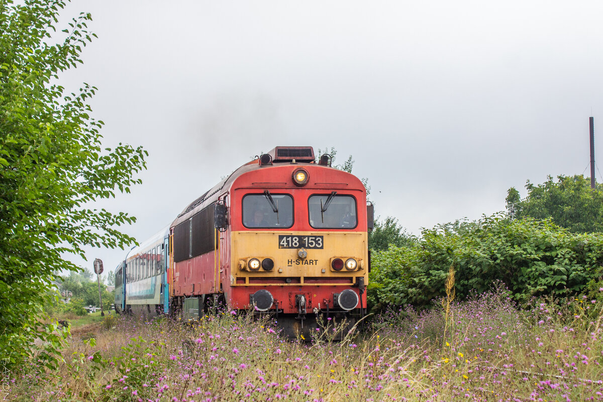 Die Lokomotive 418 112 (M41) mit einem Personenzug nach Budapest fährt zur Staatsgrenze / Tschop, Ukraine / 19.07.2025
