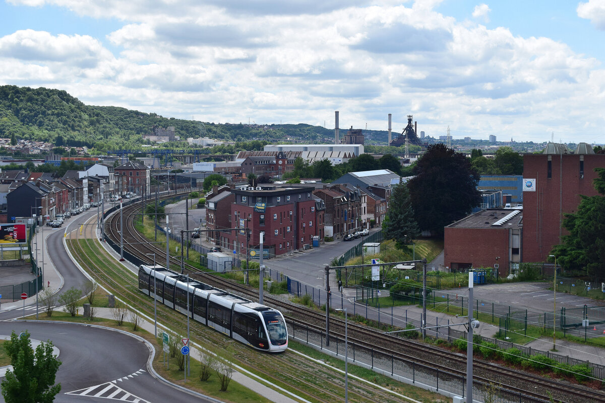 Die Relikte der Stahlindustrie in Lüttich sind immernoch allgegenwärtig, verschwinden aber leider langsam Stück für Stück. So wird auch irgendwann das Stahlwerk verschwunden sein. Unten fährt eine Straßenbahn entlang der Rue Ernest Solvay nach Slessin Standard.