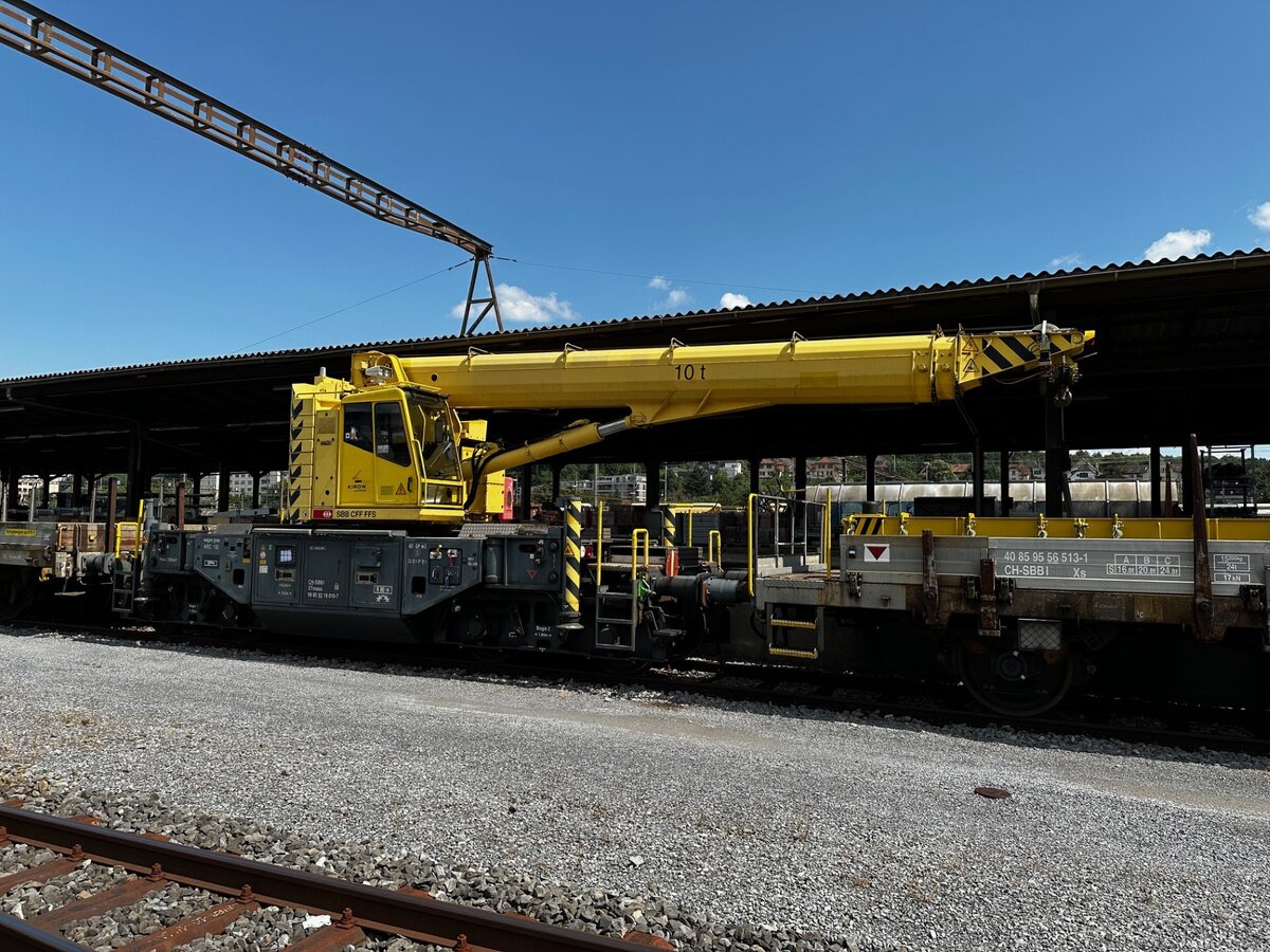 In den Wochen 29/30 haben wir Masten ausgerüstet, für Reuchenette-Péry. Mit dem Kirow Kran haben wir die Masten verteilt und am Schluss, auf den Wagen verladet. Am 14.07.2025 Biel/Bienne SBBI XTmass 99 85 92 19 010-7