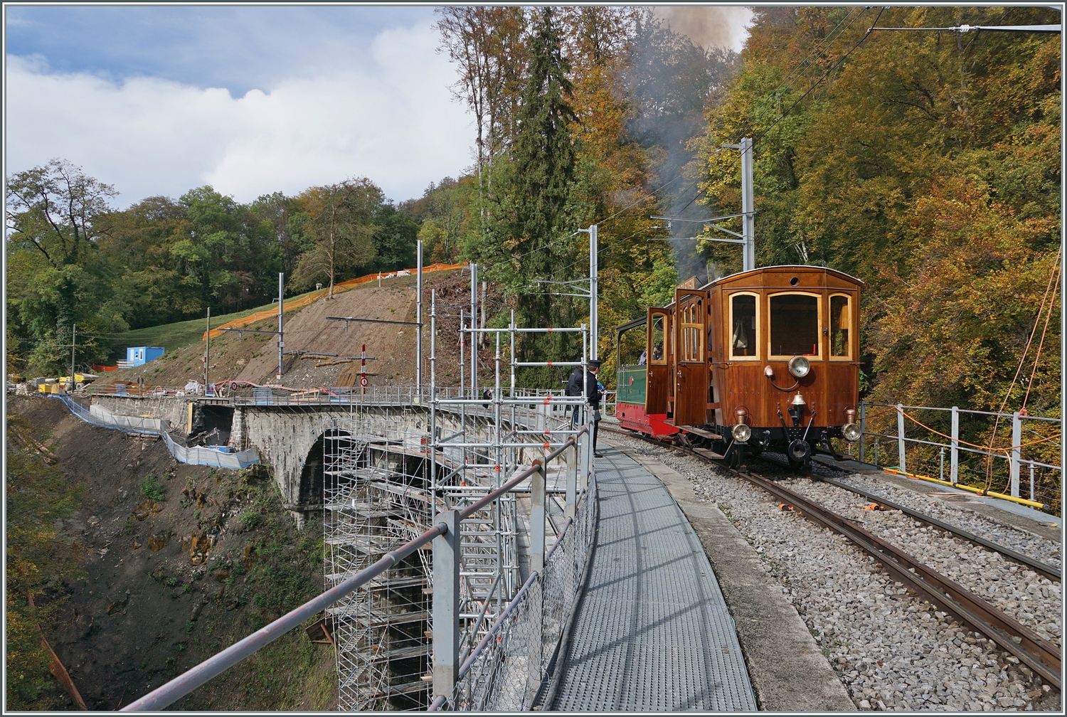 La DER de la Saison 2023  im Rahmen der Saisonschlussveranstaltung  La DER de la Saison 2023  bot die Blonay Chamby Bahn aus eine Fahrt zur Baustelle des Baye de Clarens Viaduktes an, wobei natürlich aus Sicherheitsgründen dort  keine grossen Sprünge  gemacht werden konnten. Trotzdem konnte ich unter Aufsicht des Personals diese beiden hier zu sehenden Bilder anfertigen. Das Zweite Bild zeigt die Bauarbeiten am westlichen Brückenkopf, welcher durch den Bergdruck besonders strak deformiert ist und durch eine neue  Gleit -Konstruktion ersetzt werden wird.