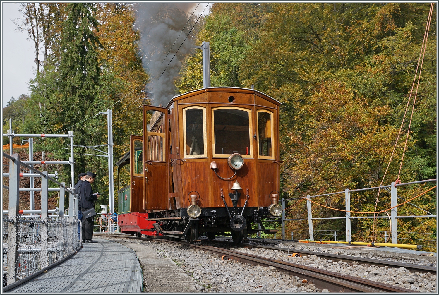 "La DER de la Saison 2023" im Rahmen der Saisonschlussveranstaltung "La DER de la Saison 2023" bot die Blonay Chamby Bahn aus eine Fahrt zur Baustelle des Baye de Clarens Viaduktes an, wobei natürlich aus Sicherheitsgründen dort "keine grossen Sprünge" gemacht werden konnten. Trotzdem konnte ich unter Aufsicht des Personals diese beiden hier zu sehenden Bilder anfertigen. Das erste zeigt den hervorragend restaurierten AL CF2 Abteilwagen mit Gepäckabteil N° 21, Baujahr 1900 bei der SIG beim Halt auf dem Viadukt. Der Wagen wurde von der G 2/2 N° 4 "Rimini" traktiert. 28. Oktober 2023
