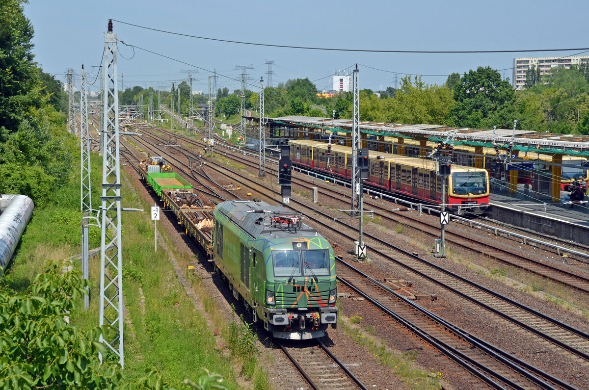 Aus Richtung des Rbf Berlin Nordost kommend rollt 248 024 der BUG mit einem kurzen Flachwagenzug am 17.06.25 vorbei am S-Bahnhof Springpfuhl Richtung Süden.