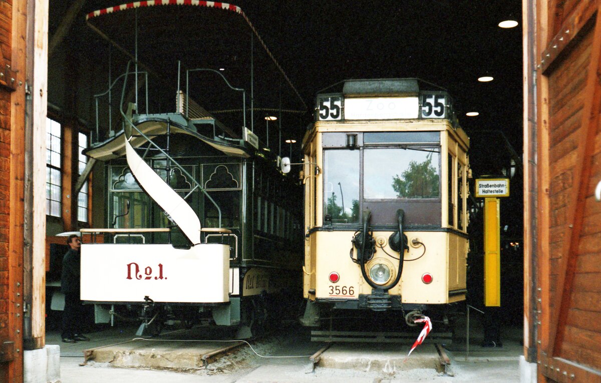 Berlin__Fahrzeugsammlung der BVG in den ehemaligen Wagenhallen der  Fliegenden Berliner“. an der Monumentenbrücke (nahe S-Bhf. Yorkstraße). Neben Bussen, U-und S-Bahn-Fahrzeugen gab es u.a. diese Straßenbahnwagen zu sehen: Wagen Nr. 1 der Berliner Pferdeeisenbahn von 1865, Tw 3566 von 1927, der als Linie 55 den Korso am letzten Betriebstag der West-Berliner Straßenbahn am 2. Oktober 1967 anführte.__29-09-2002