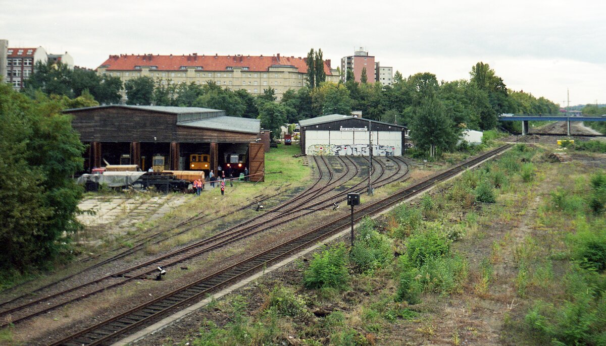 Berlin__Fahrzeugsammlung der BVG in den ehemaligen Wagenhallen der  Fliegenden Berliner“ von der Monumentenbrücke aus gesehen (nahe S-Bhf. Yorkstraße).__29-09-2002