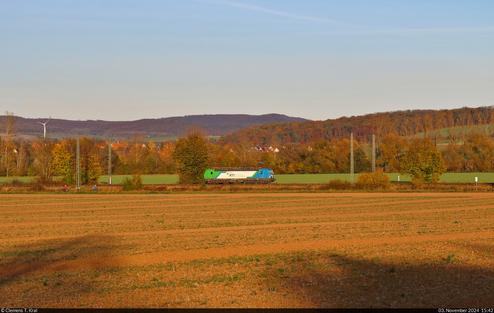 Besuch aus der Slowakei: Eine 383 (Siemens Vectron) auf Solofahrt durch die Herbstlandschaft bei Obernjesa Richtung Eichenberg. 🧰 Railtrans International a.s. (RTI) 🕓 3.11.2024 | 15:42 Uhr