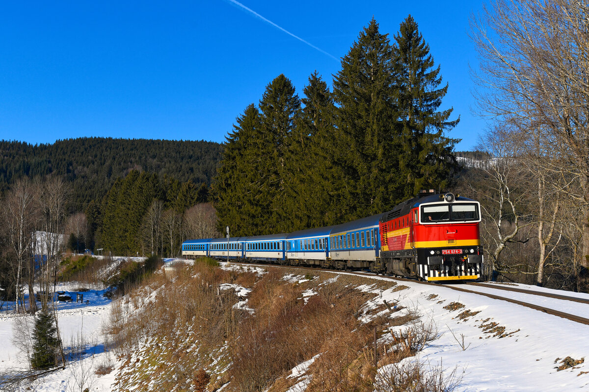 Anfang diesen Jahres kam die im perfekten Pflegezustand befindliche "rote Blitz-Brille" 754.074 des Depots Plzen regelmäßig vor den Prager Schnellzügen im Böhmerwald zum Einsatz. Der 18. Januar 2025 wurde aufgrund guter Wetterprognosen genutzt, um der Region einen Besuch abzustatten. Zwischen Špičák und Železná Ruda město konnte ich besagte Lok vor dem R 776 "Berounka" von Praha hl.n. nach Železná Ruda-Alžbětín aufnehmen. Der Schnellzug war an diesem Tage interessant gebildet. Neben zwei UIC-Y Wagen befand sich auch ein Waggon der Gattung Bpee237 im Zugverband.
