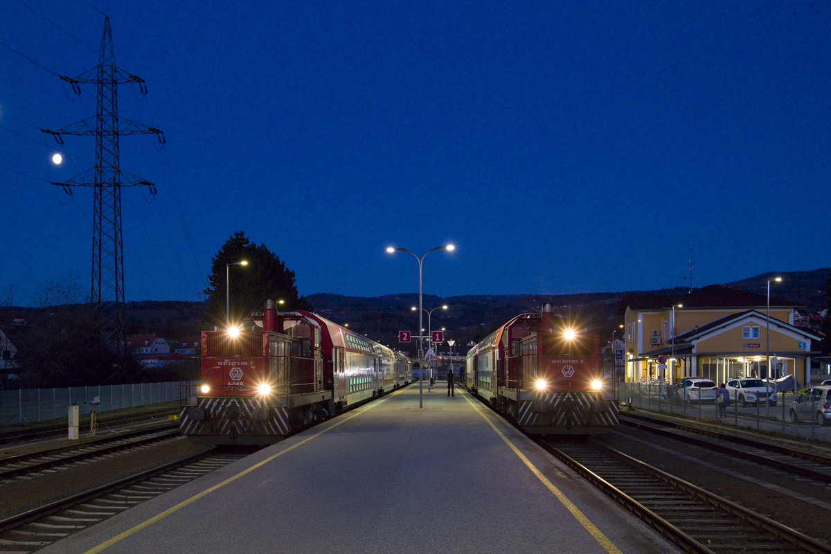 Auf der Köflacherbahn kommen im Frühverkehr aktuell noch drei mit Loks der Reihe 1500 bespannte Dosto-Garnituren zum Einsatz. Am 18. März 2025 gaben sich 1500.2, die mit der S7 8408 sowie 1500.6, die mit der S7 8410 den Weg nach Graz Hbf antreten sollten im Bahnhof Köflach ein kurzes Stelldichein.