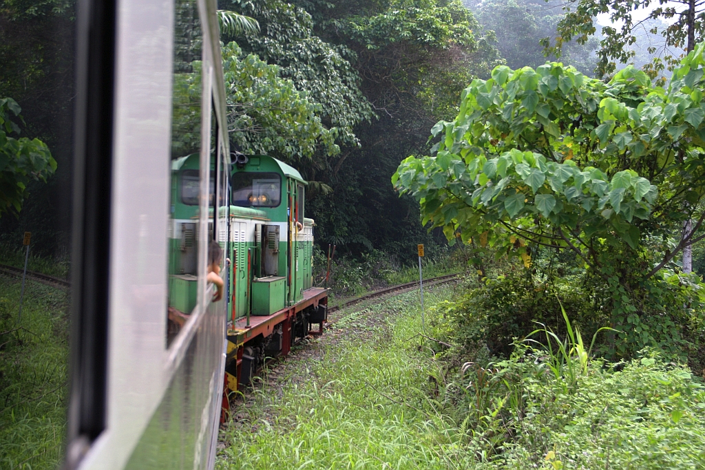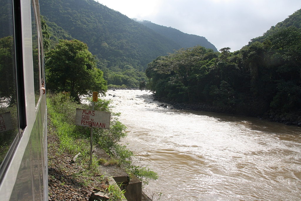 Blick aus dem untauglichem JKNS 8801 (Hersteller: OEPL, Ovis Equipments Private Ltd., Indien, Baujahr: 2017) am 14.Februar 2025 während der Fahrt als abgeschleppter Zug PS101 nach Tenom auf das Padastal mit dem gleichnamigem Fluss.