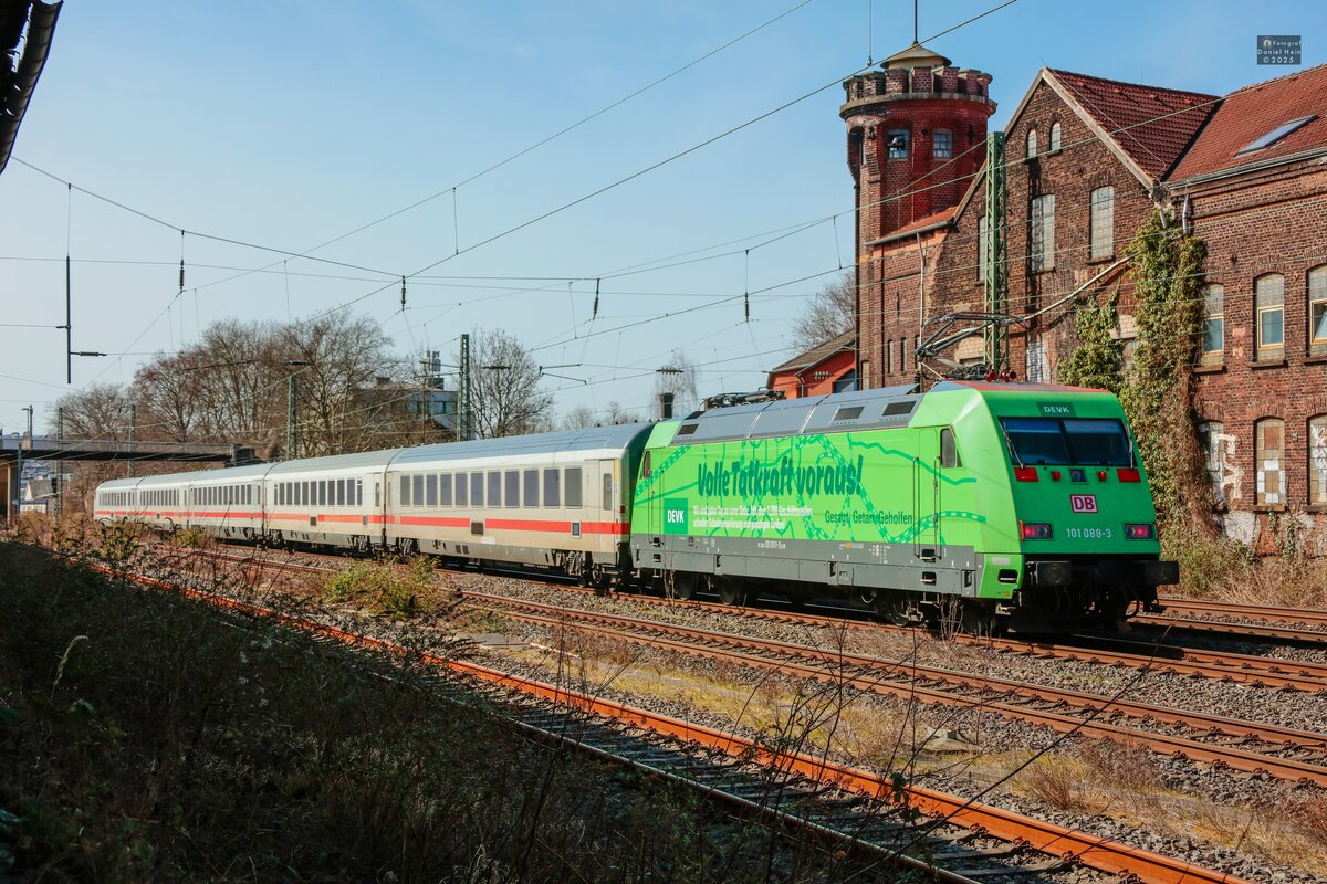 DB 101 088-3 "DEVK" Volle Tatkraft voraus! mit IC in Wuppertal, März 2025.