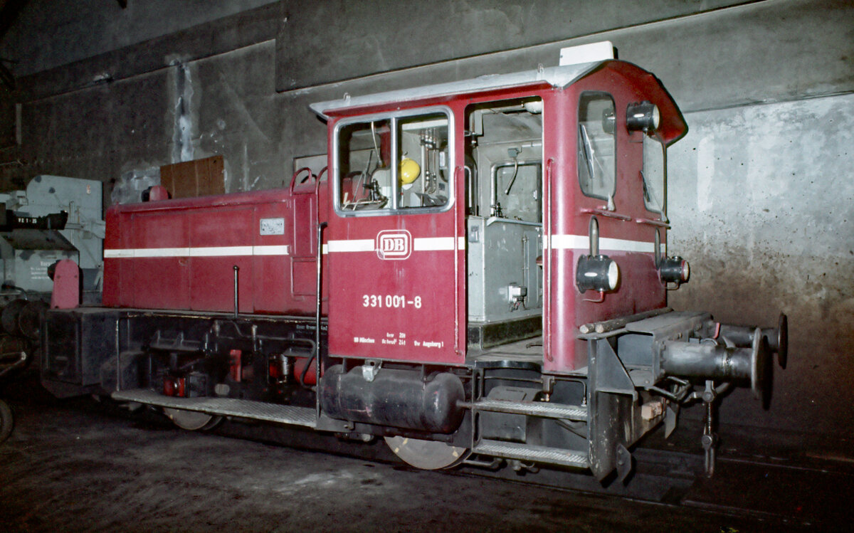 Der LG III-Prototyp 331 001 von 1959 - ex Köf 10 001 - am 31.10.1983 im Bw. Augsburg. Später wurde die Kleinlok noch in 332 601 umgezeichnet.