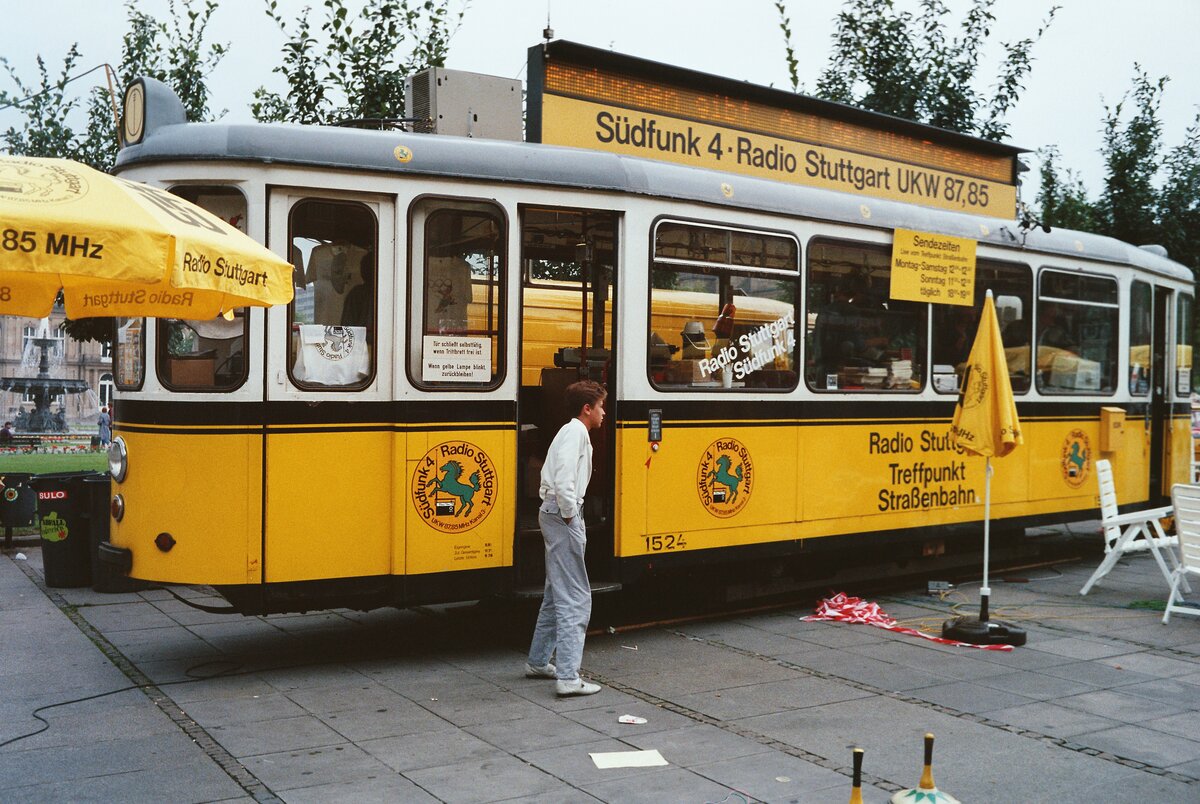 Das "Schiffchen" ist wieder auf dem Stuttgarter Schloßplatz! Beiwagen 1524 (Serie B2 "Schiffchen" genannt) als Werbeträger in der Stuttgarter City (Datum unbekannt)