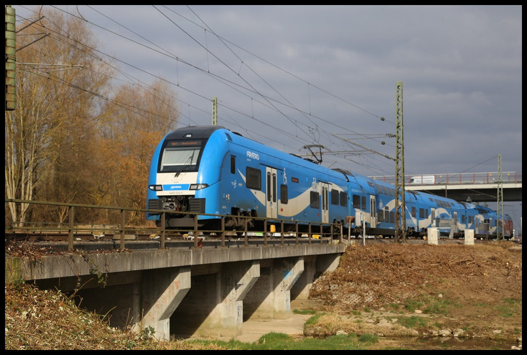 Ein Mireo von Arverio überquert hier am 17.3.2025 um 10.50 Uhr die Wörnitz im schwäbischen Harburg auf der Fahrt als RE nach München.