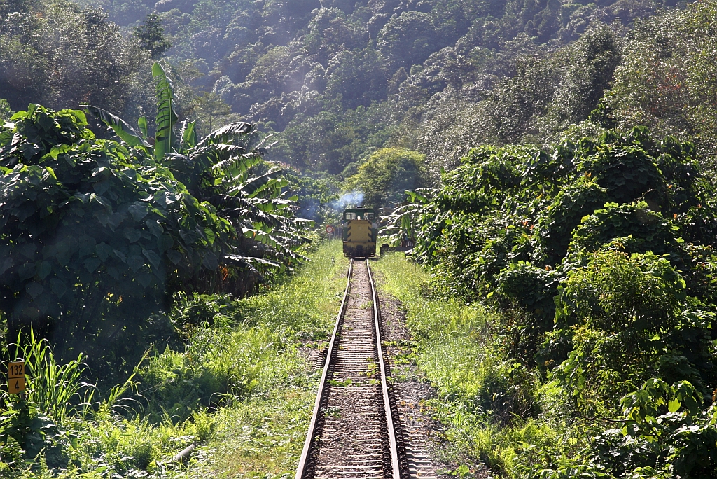JKNS 5205 (B'B' dh, Kawasaki, Kobe / Japan, Bj.1971, Fab.Nr. ???) nähert sich am 14.Februar 2025 als Lokzug von Tenom dem Strecken-Km. 132,30 um den, als Zug PS101 verkehrenden und nach einem Luftleitungsbruch untauglich liegengebliebenen, JKNS 8801 (Hersteller: OEPL, Ovis Equipments Private Ltd., Indien, Baujahr: 2017) abzuschleppen.