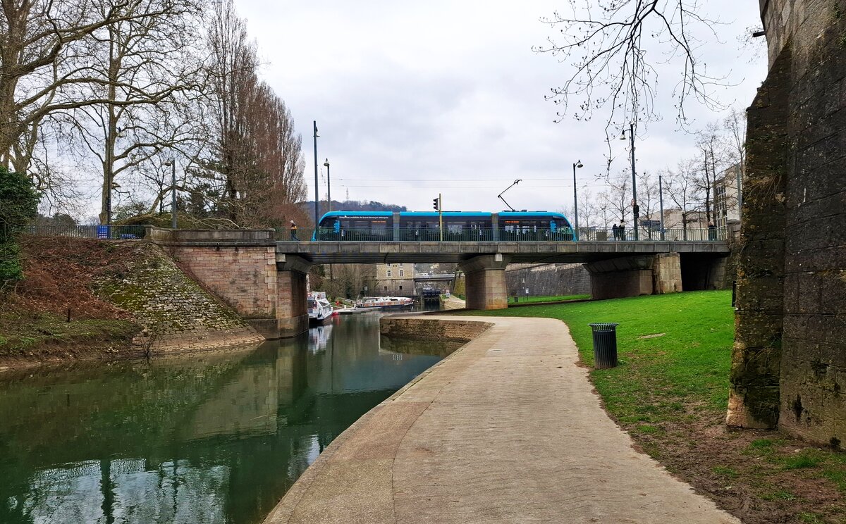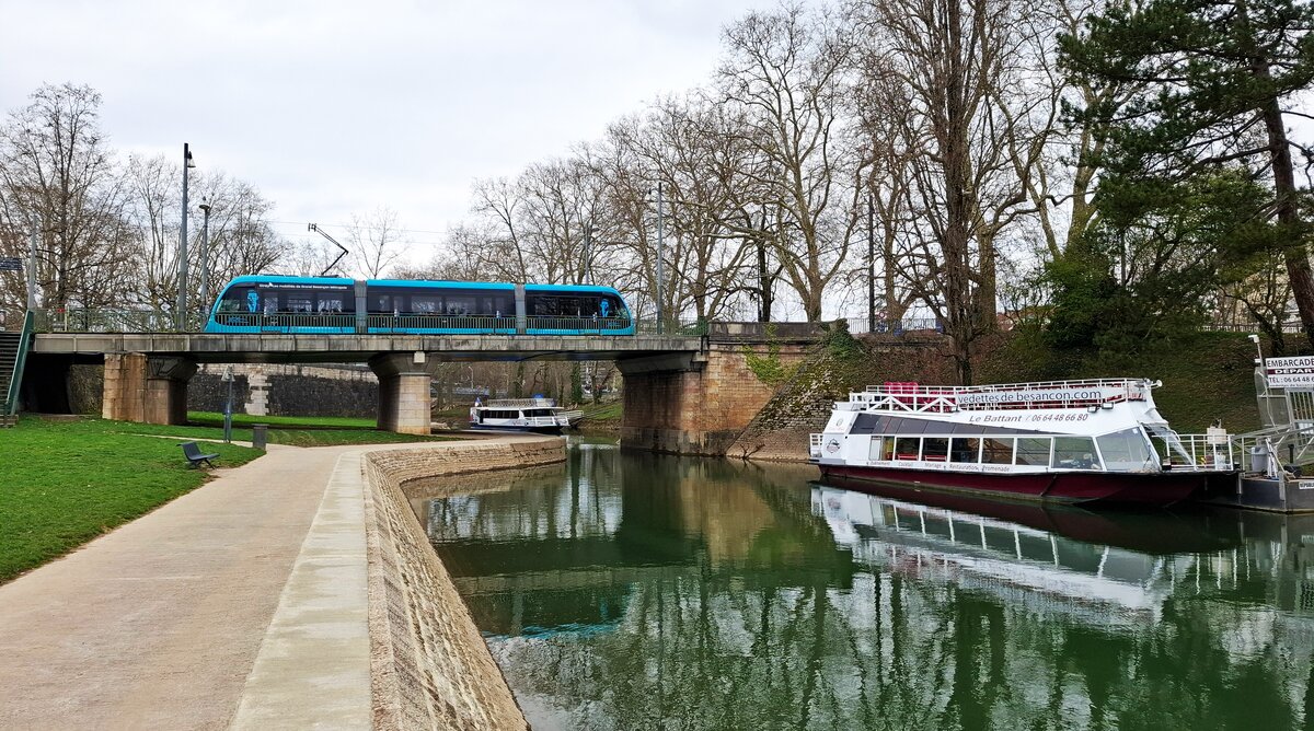 Tram Besançon__Auf der Brücke Pont de la République über den Seitenkanal des Doubs (Rhône-Rhein-Kanal).__03-2025