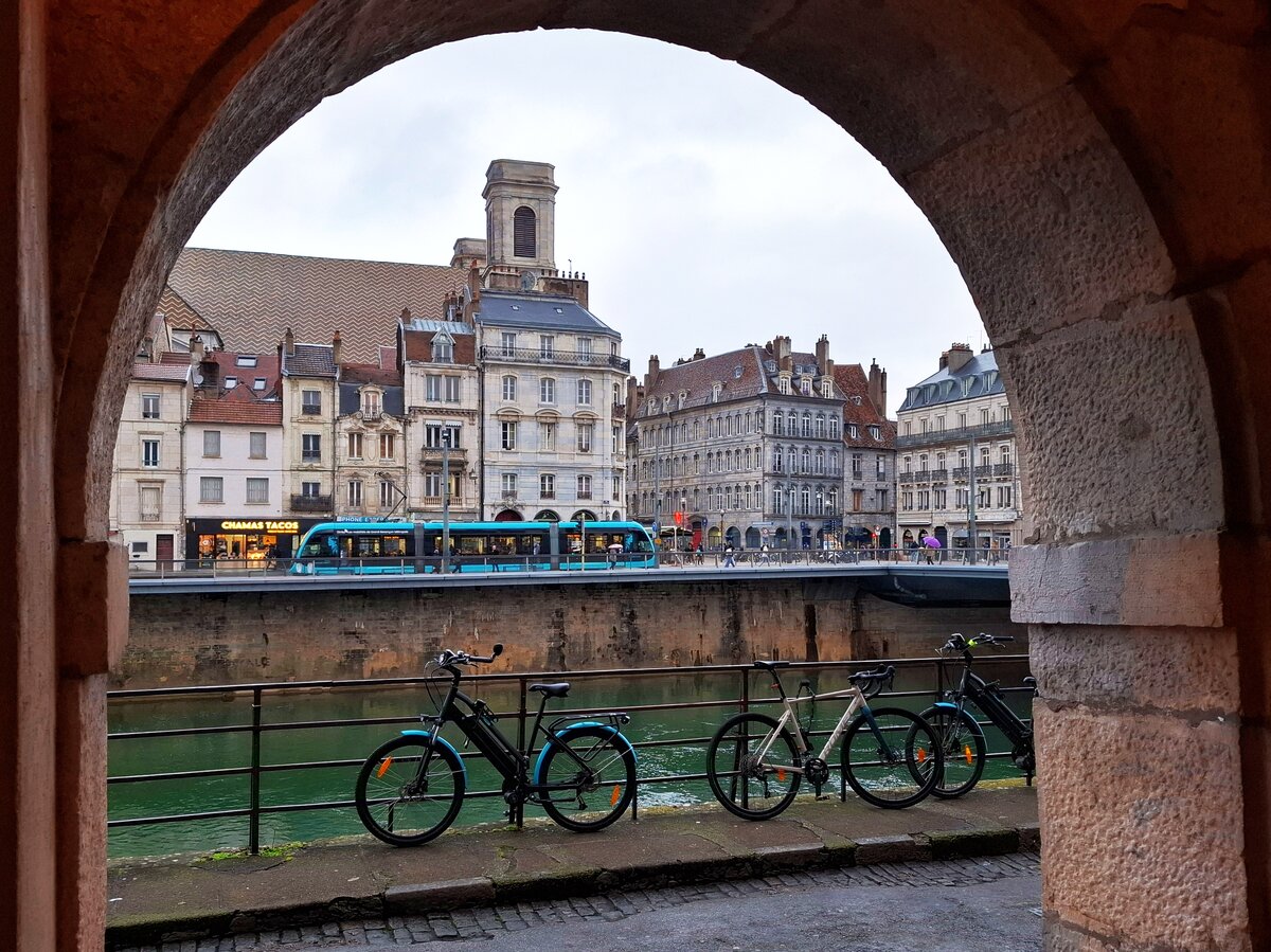 Tram Besançon__Auf der Brücke Pont de la République über den Seitenkanal des Doubs (Rhône-Rhein-Kanal) mit Schleuse im Hintergrund.__03-2025