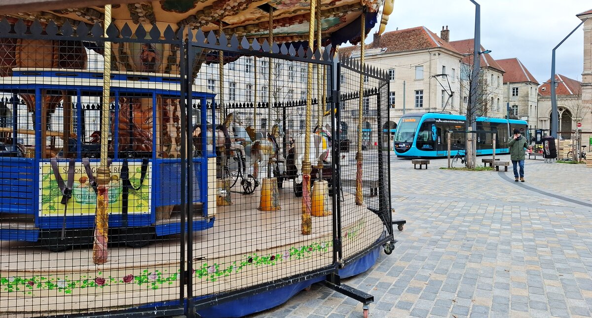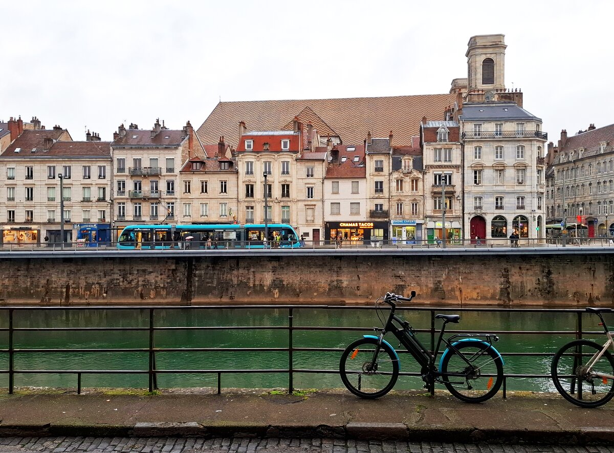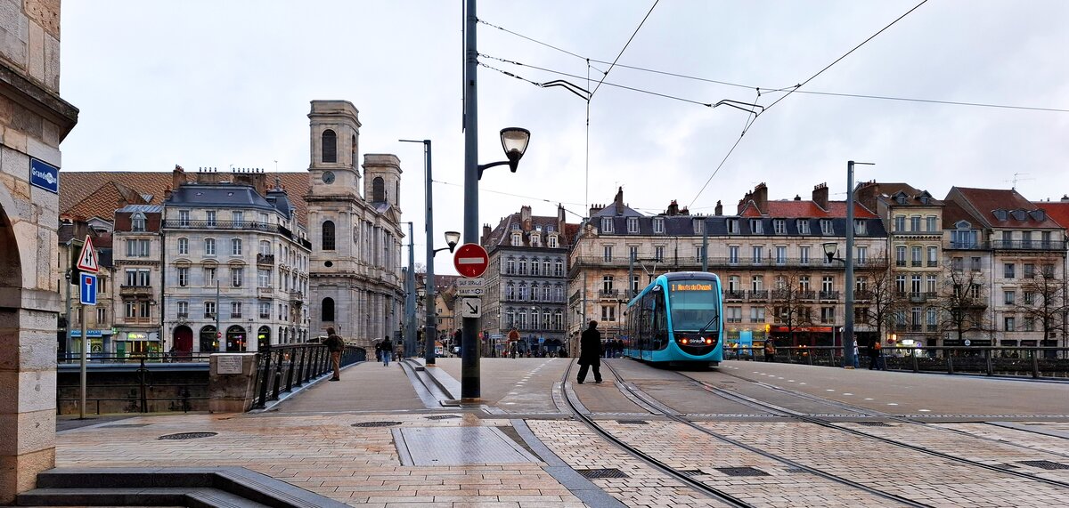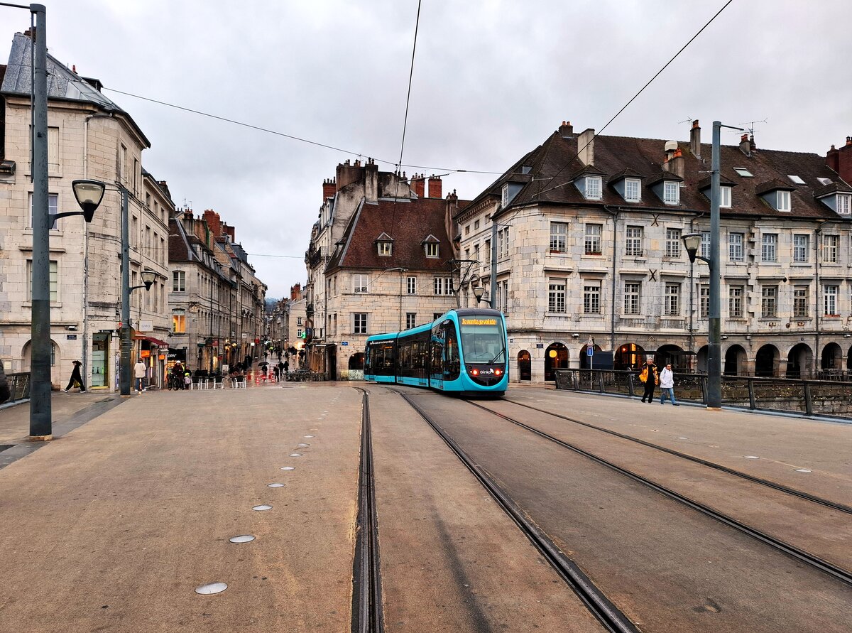 Tram Besançon__62 Jahre nach der Betriebs-Einstellung hat Besançon 2014 wieder eine Straßenbahn mit knapp 15 km Streckenlänge bekommen. Tw nach Hauts-du-Chazal bei der Haltestelle 'Canot' am Doubs-Ufer (Quai Veil-Picard). Im Hintergrund die Brücke Pont Battant die zur Altstadt von der Straßenbahn gequert wird. Die Ziel-Anzeigen der Trams zeigen abwechselnd das Fahrtziel und die "Aufforderung" an die möglichen Fahrgäste: "Je monte.Je valide."/"Ich steige ein.Ich entwerte"(meine Fahrkarte).__03-2025