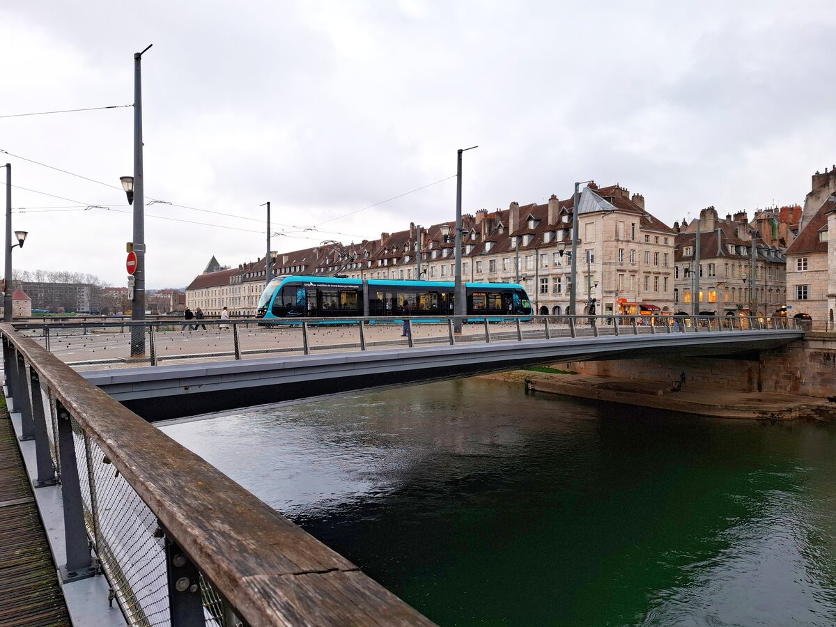 Tram Besançon__Auf der Brücke Pont Battant über der Doubs.__03-2025