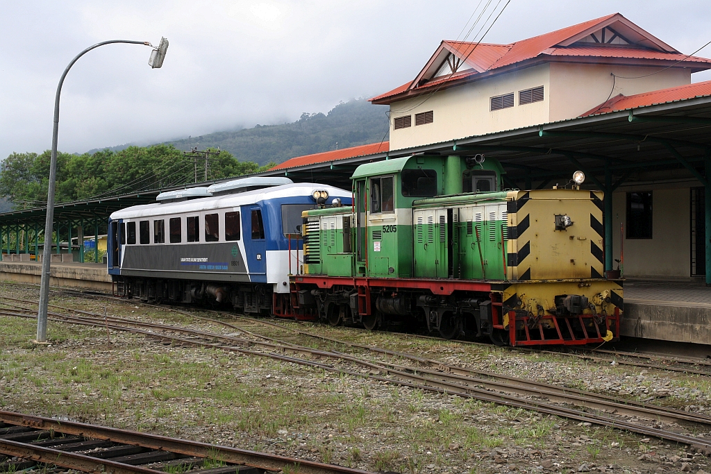 Von der Hilfslok JKNS 5205 (B'B' dh, Kawasaki, Kobe / Japan, Bj.1971, Fab.Nr. ???) abgeschleppter, mit dem JKNS 8801 (Hersteller: OEPL, Ovis Equipments Private Ltd., Indien, Baujahr: 2017) untauglich gewordener Zug PS101 ist am 14.Februar 2025 in der Stesen Tenom angekommen.