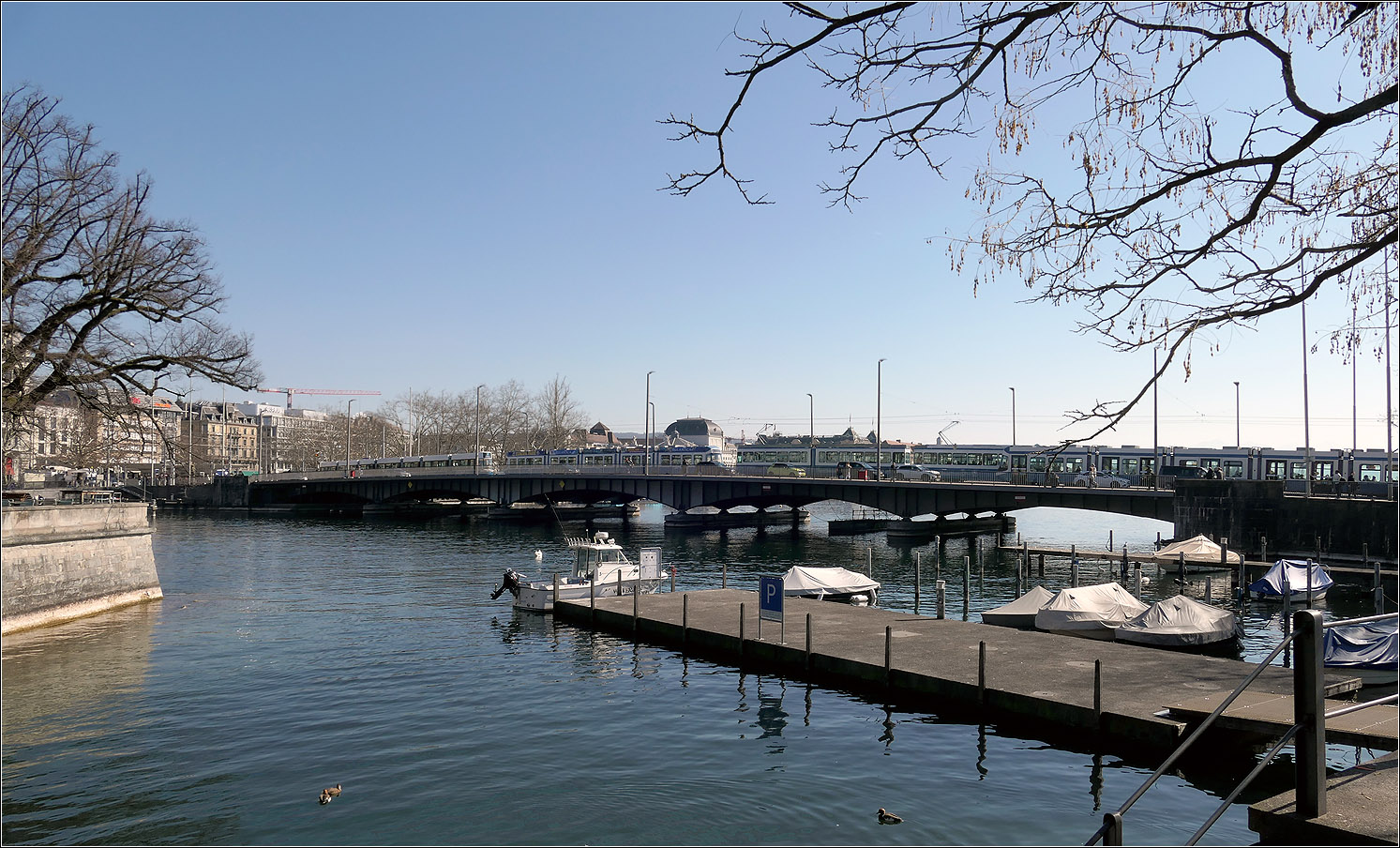 Auf der Quaibrücke herrscht meist reger Tramverkehr. Hier verkehren die Linien 2, 5, 9 und 11. Auf dem Bild zu sehen ist ein Tram 2000, zwei Cobras und ein Flexity-Tram.
