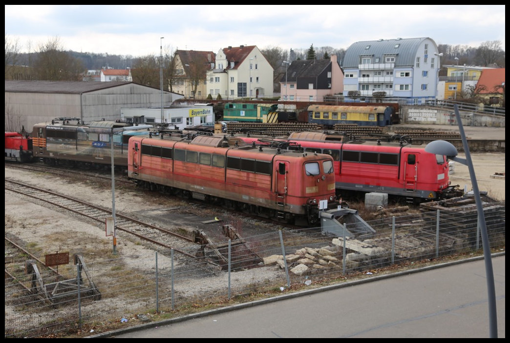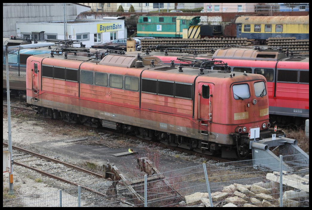Bei einem Zwischenstopp in Nördlingen fotografierte ich vom Parkhaus am Bahnhof aus zahlreiche aufgereihte Lokomotiven der Museums Sammlung des BW Nördlingen. Da wartet noch viel Arbeit auf die Aktiven. Im Vordergrund ist hier die ex DB 151031 zu sehen. Sie verdeckt die dahinter stehenden 151106.