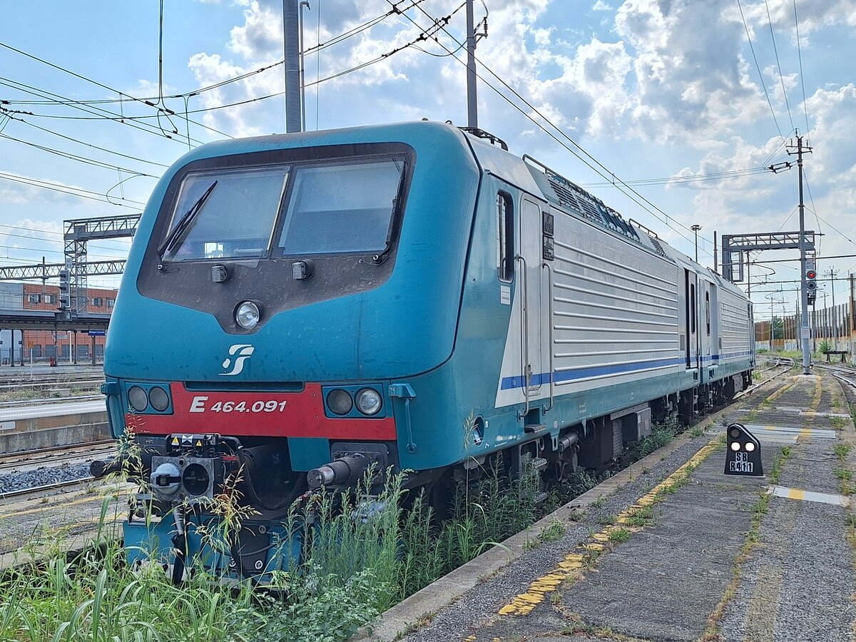 464 091 der Trenitalia zusammen mit einer Schwesterlokomotive, fotogarfiert am 17.07.2024 um 16:20 Uhr im Bahnhof Bologna Centrale.