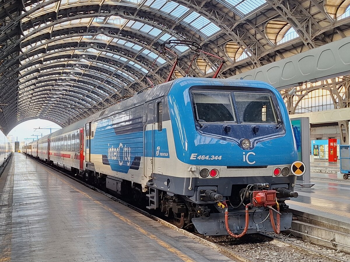 464 344 in den neuen IC-Farben der Trenitalia, fotografiert am 17.07.2024 um 18:31 Uhr im Bahnhof Milano Centrale.