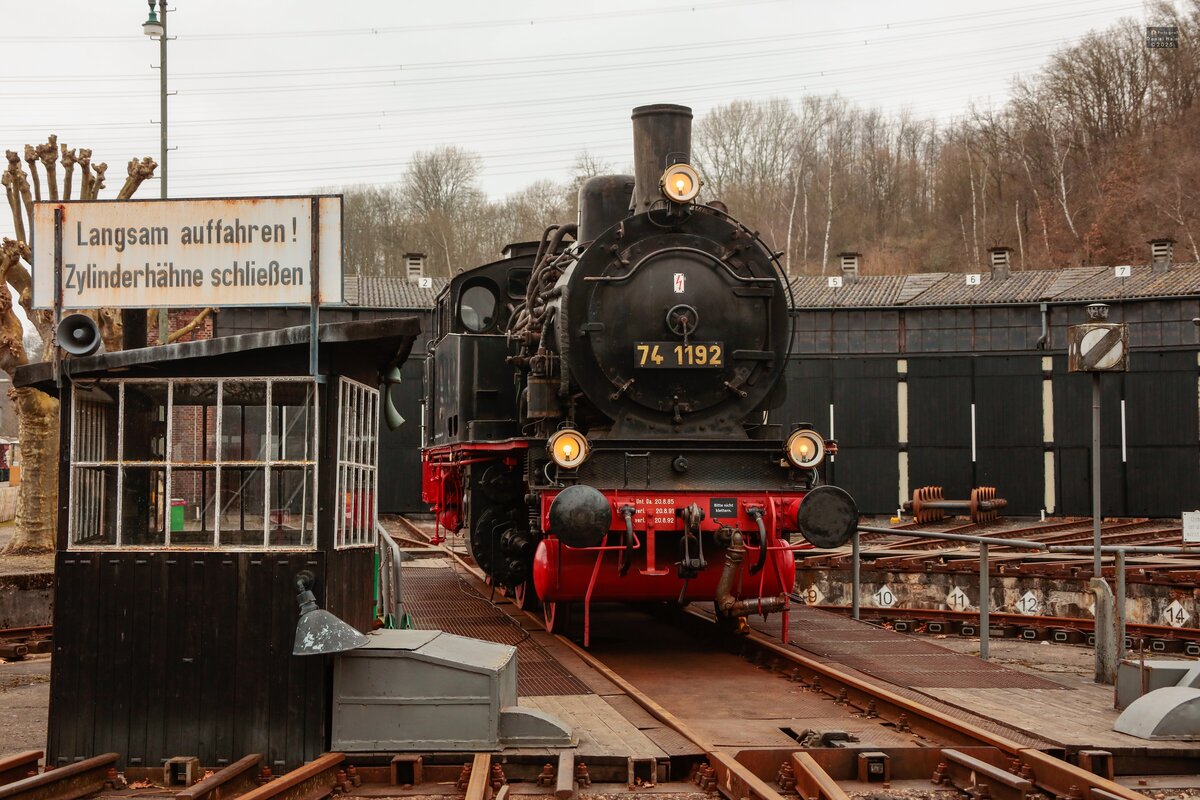 74 1192 auf der Drehscheibe im Eisenbahnmuseum Bochum Dahlhausen, März 2025.