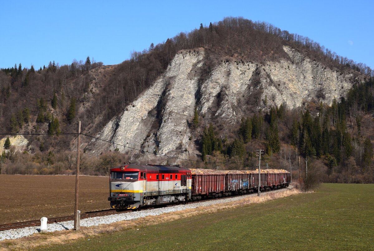 Die 751 037-er Bardotka mit dem Verschubgüterzug Mn 86550 fährt durch das Arwatal (Orava Tal) kurz vor Kraľovany.