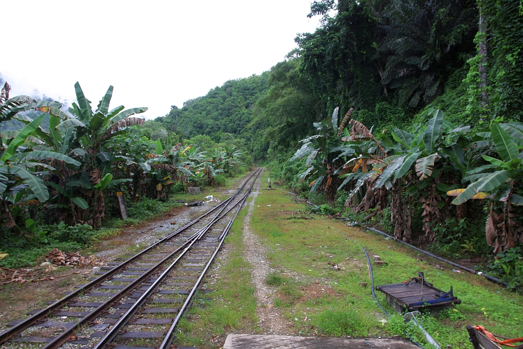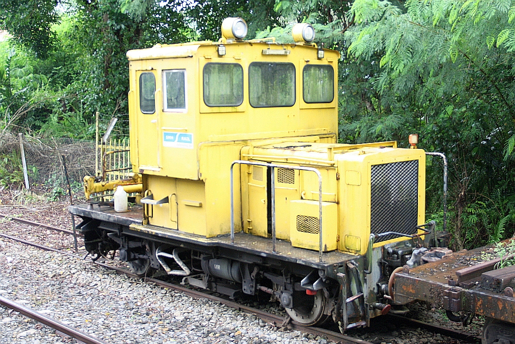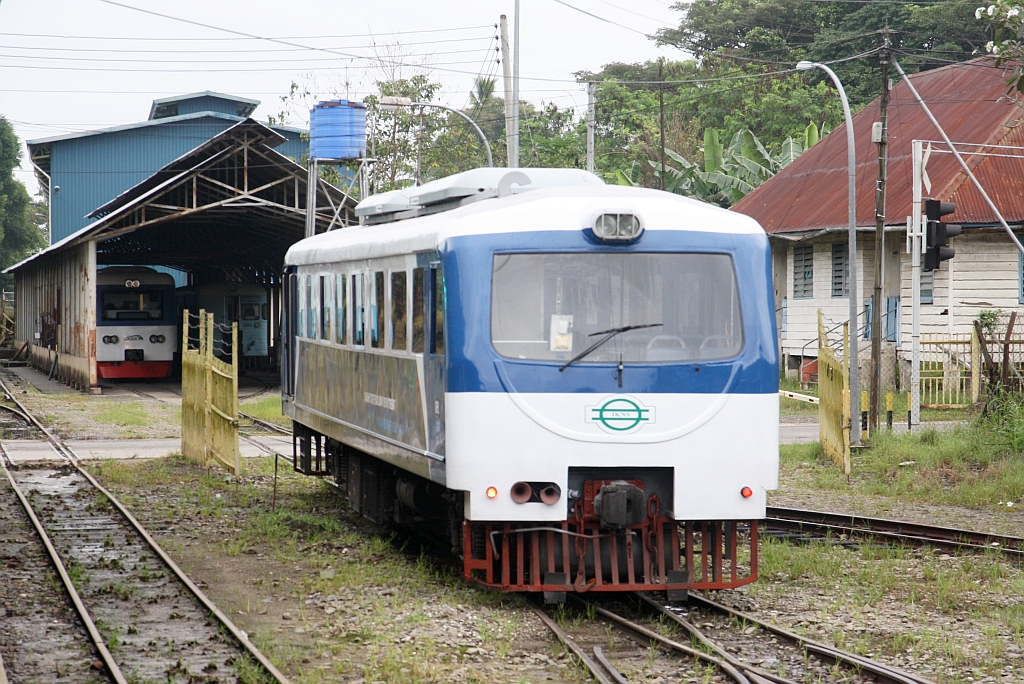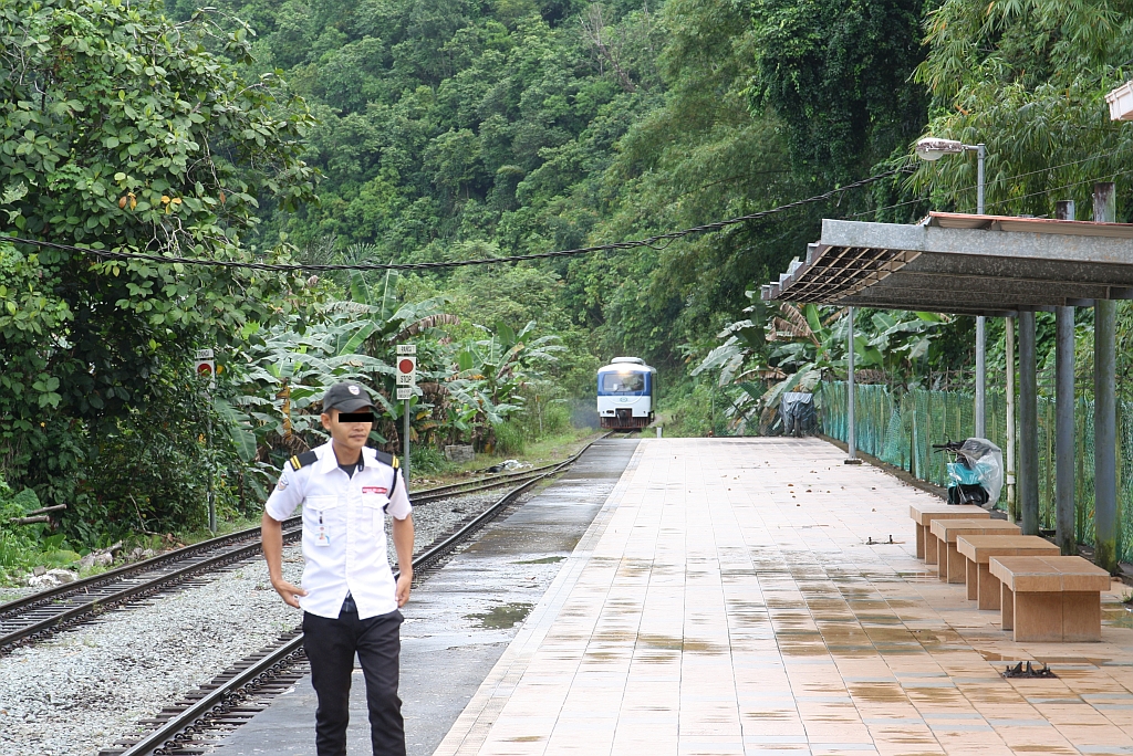 Stesen Pangi am Morgen des 13.Februar 2025. - Im Hintergrund der JKNS 8801 (Hersteller: OEPL, Ovis Equipments Private Ltd., Indien, Baujahr: 2017) als Zug PS101 vom 2 Km entfernten Haltepunkt Batu 78 kommend.