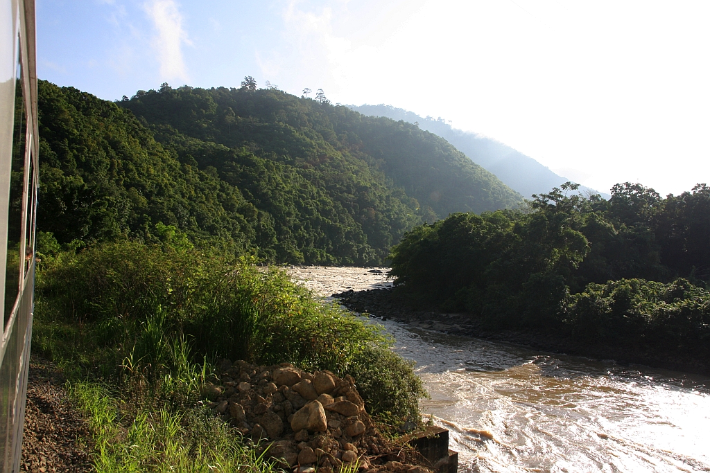 Blick aus dem JKNS 8801 (Hersteller: OEPL, Ovis Equipments Private Ltd., Indien, Baujahr: 2017) am 14.Februar 2025 während der Fahrt als Zug PS101 nach Tenom auf das Padastal mit dem gleichnamigem Fluss beim Strecken-Km. 131,80.