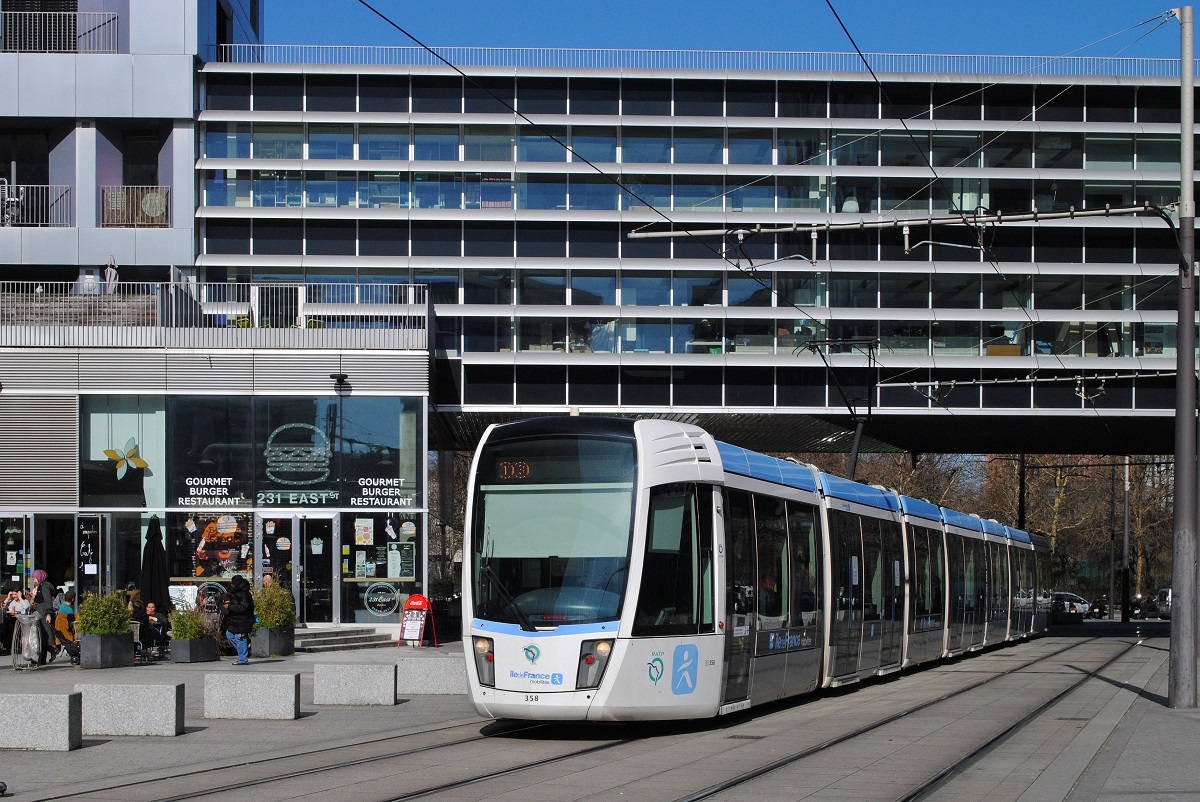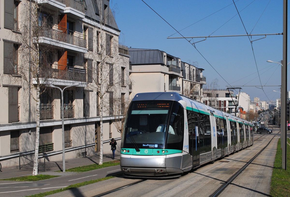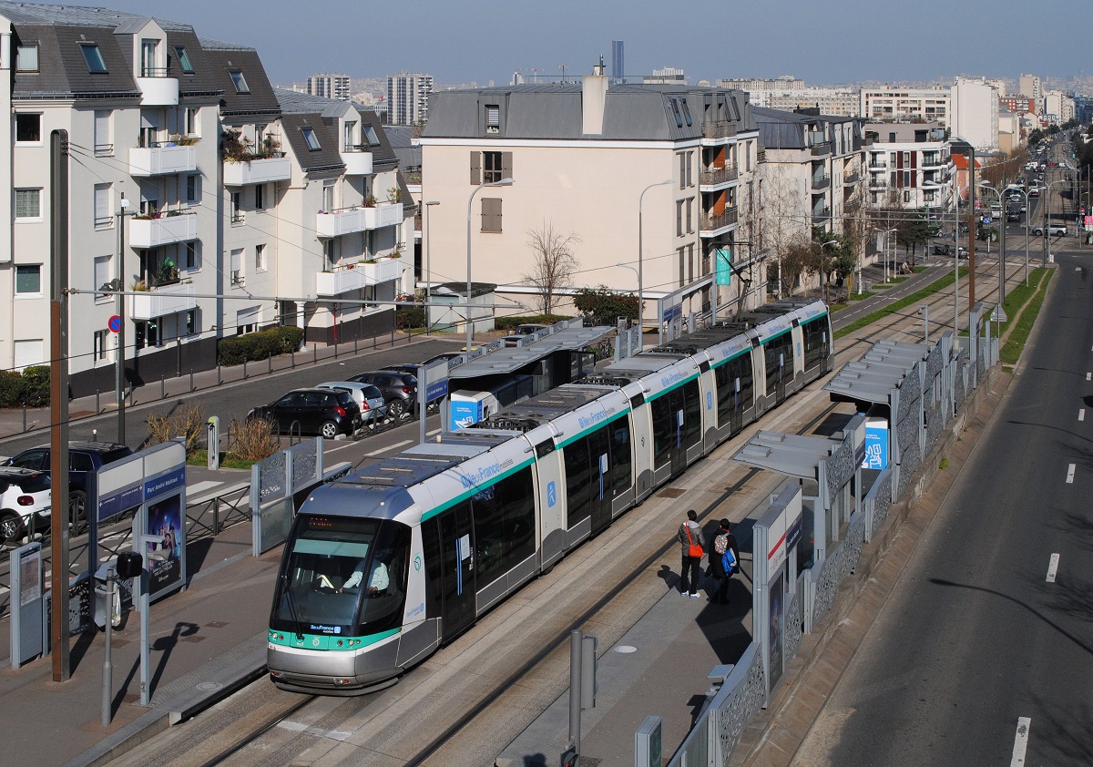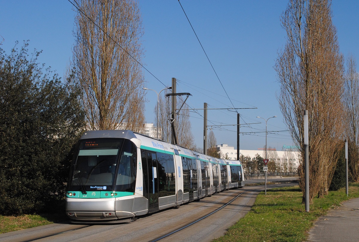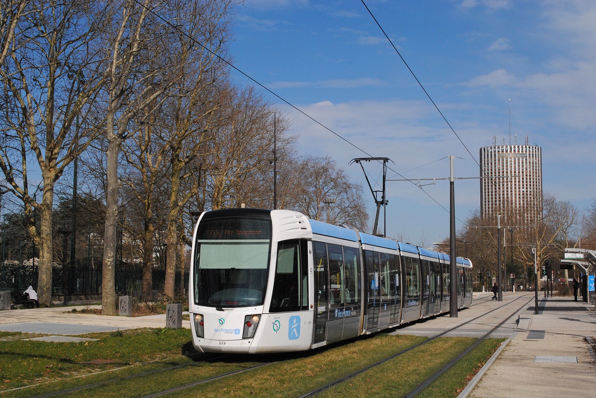 TFS2 202 hat soeben die Endstelle Asnieres - Quatre Routes der Linie T1 erreicht und zieht nun in die dahinterliegende Wendeanlage vor. (05.03.2025)