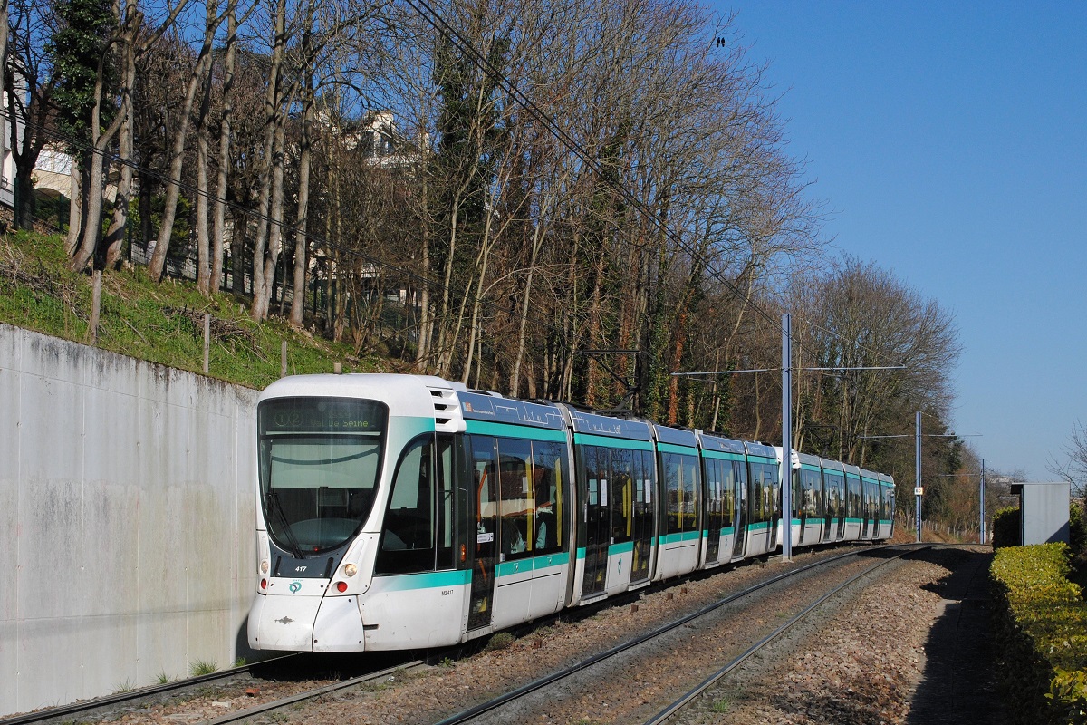Im Vorort Saint Cloud erreicht der aus den Tw.417+413 bestehende Zug der Linie T2 die Haltestelle Les Milons. (03.03.2025)