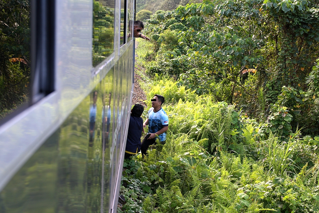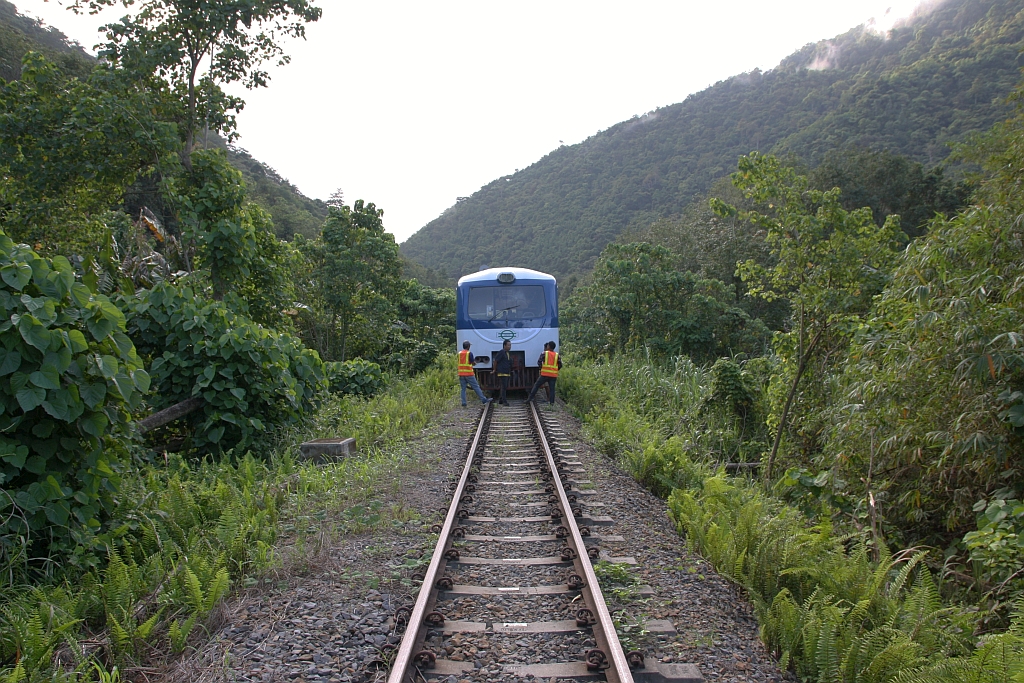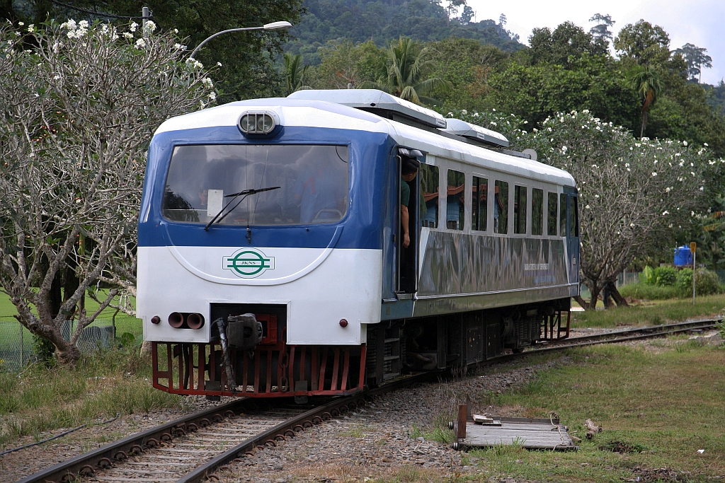 JKNS 8801 (Hersteller: OEPL, Ovis Equipments Private Ltd., Indien, Baujahr: 2017) wendet am 14.Februar 2025 im Haltepunkt Batu 78 von Zug PU502 auf Zug PS101. Die Strecke weiter nach Haloligat war wegen Hangrutschungen unterbrochen sodass ein Inselbetrieb zwischen Tenom und Pangi (und 2 Km weiter nach Batu 78) eingerichtet wurde.