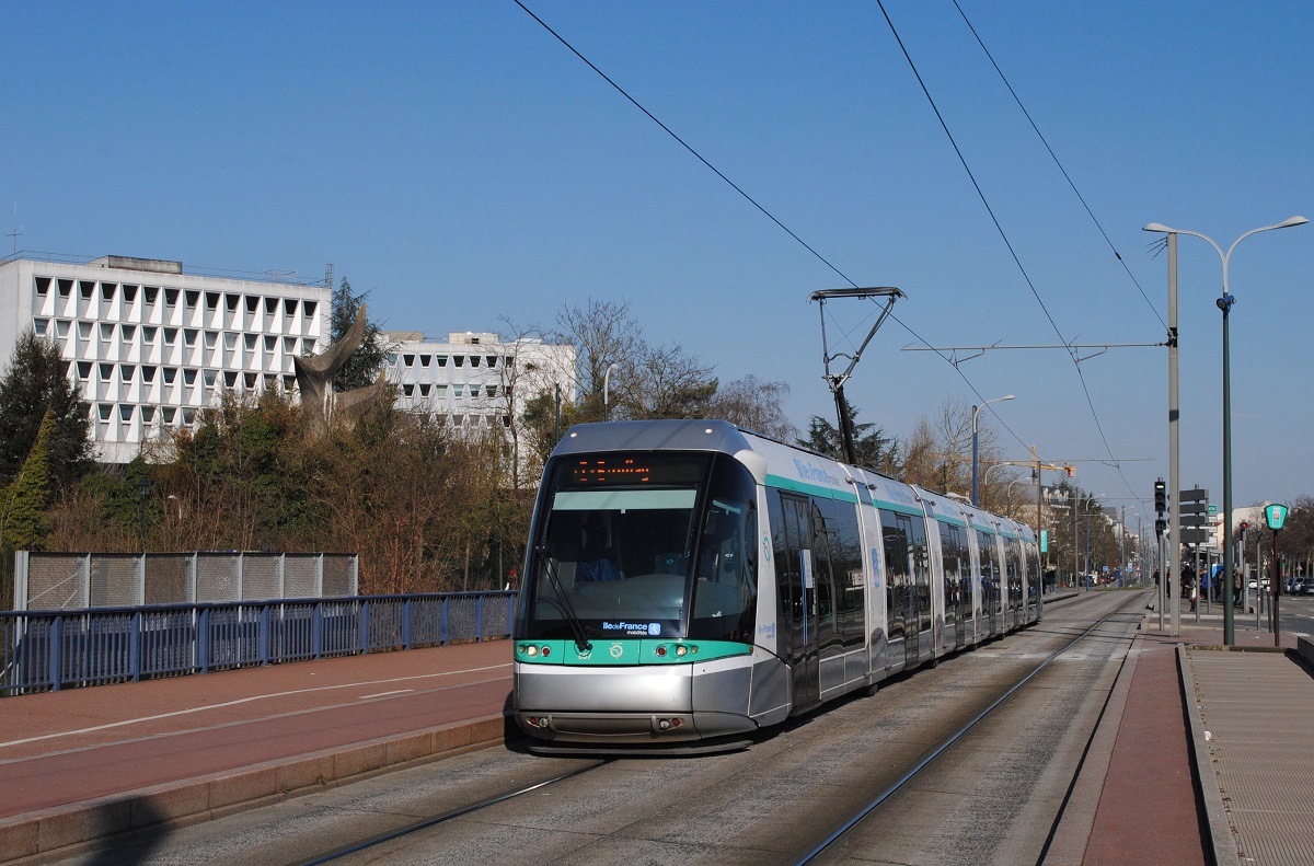 Tw.449+405 als Linie T2 im Vorort Issy les Moulineaux an der Haltestelle Jacques - Henry Lartigue. (03.03.2025)