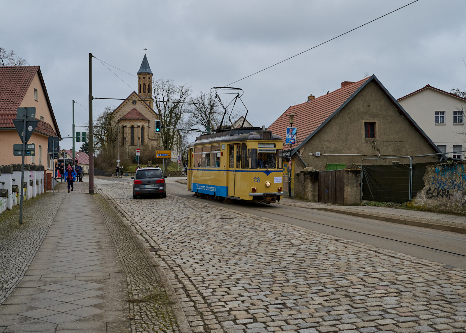 Am 01.03.2025 war Abschied der Gotha-Wagen in Woltersdorf. Gerade hat Wagen 32 die Haltestelle Goethestraße in Richtung Rahnsdorf verlassen.