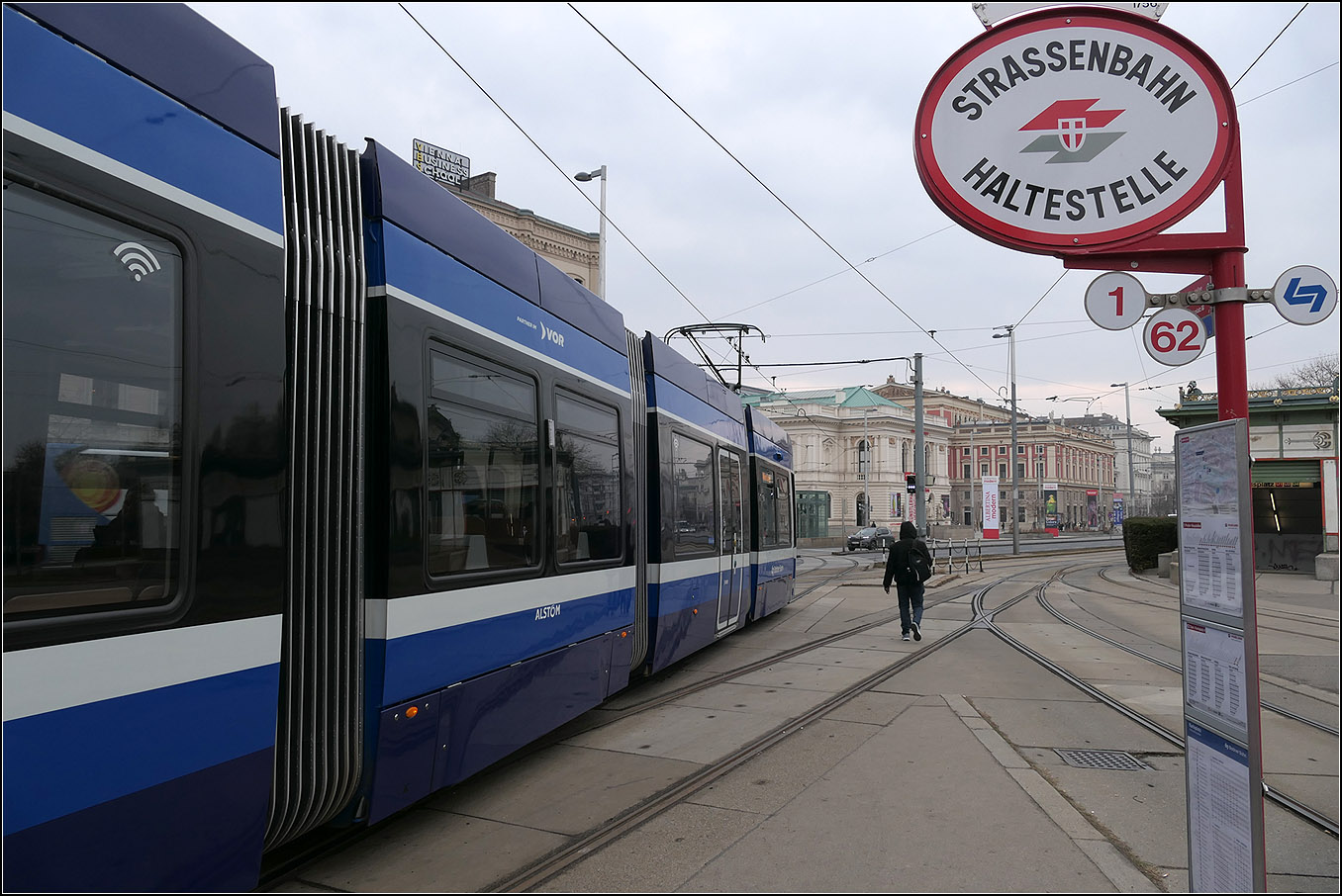 Flexity 2 529 (+ 516) steht an der Endhaltestelle Oper Karlsplatz. Auch die Straßenbahnen der Linie 62 enden an dieser Häuserblockschleife am Kärnterring. Rechts eine weitere ULF Tram die auf dem Ring in Richtung Schwarzenbergplatz unterwegs ist.