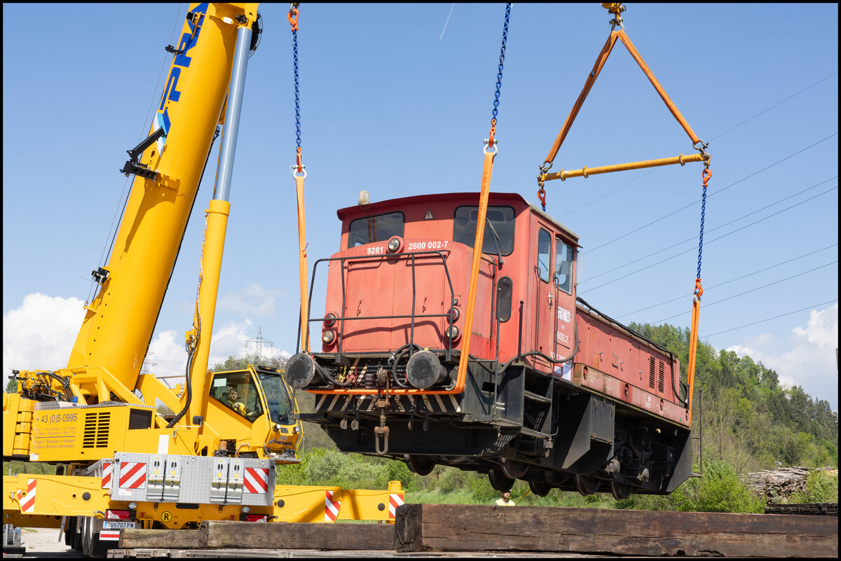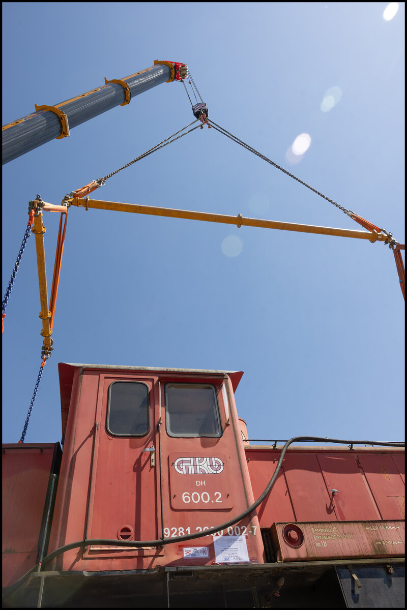 Der Aufwand die Lok zu Transportieren war doch recht Hoch . Nun aber schwebt GKB DH 600.2 am Haken des Krans. 29.04.2025